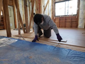 床材には「実(さね)」と言う凸凹があり、一枚ずつはめ込みながら張っていきます。