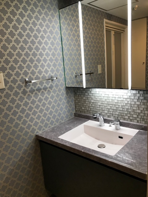 カウンターは大柄の石目模様が特徴の人造大理石。鏡下のモザイクタイルと繊細なクラシックデザインのクロスとマッチしていて、高級感のある空間に。