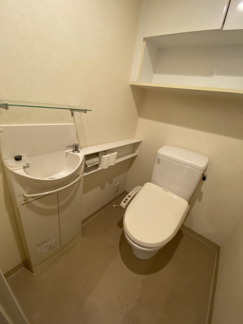 3種類の壁紙貼り分け、物寂しい印象だったトイレが明るく居心地のいい空間に大変身。小鳥のイラストがある華やかな柄がよく映えるように、事前に担当者が細かくチェックしました。
