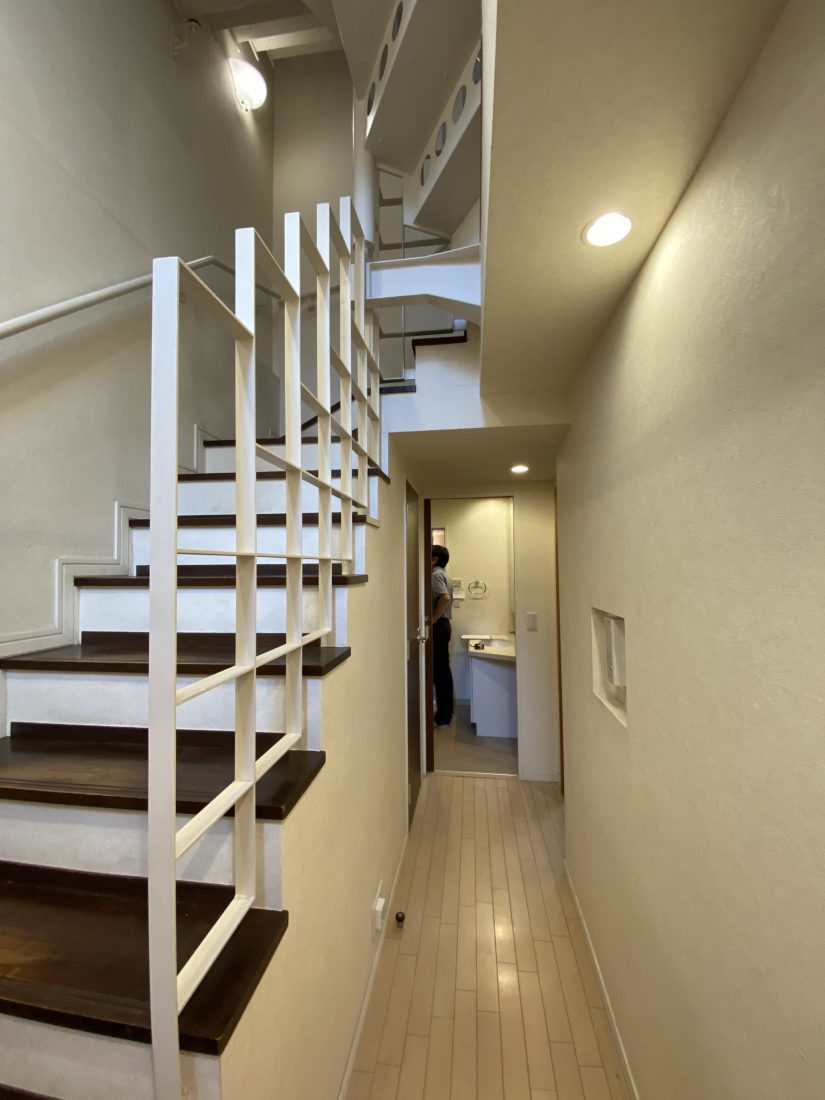洋服を着ていてもひんやりと寒い浴室と洗面室。キッチンはI型でかつ冷蔵庫の仕切り壁があり閉鎖的な空間になっていました。最大の特徴である吹き抜けの螺旋階段は白い壁ではお散歩帰りのワンちゃんが汚してしまわないか心配でした。