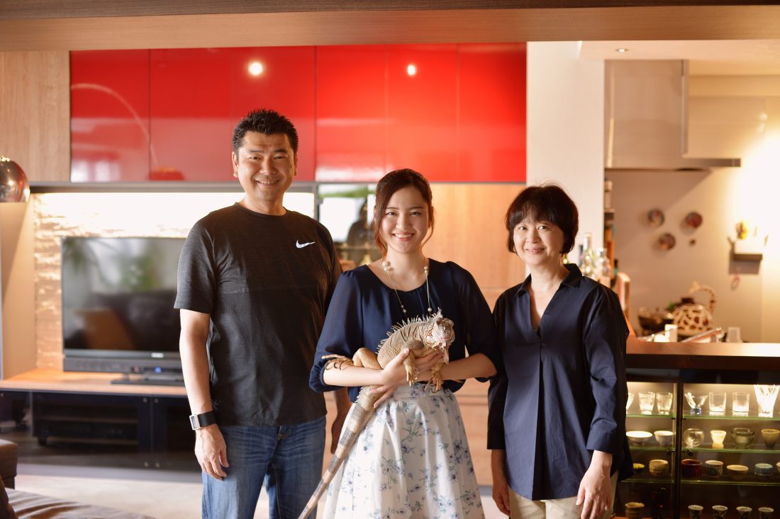 家族のアイドル的存在、イグアナのレンちゃんはフローリングだと足が滑り動きにくいため、リビングの床はフロアタイルをセレクト。特等席にと暖かい南側の場所を確保して、お天気の良い日は日向ぼっこ。そのゆったりとした光景が家族に癒しも与えてくれるレンちゃん。安心して見守るためにもオープンなキッチンで開放的な空間にしたかったそう。