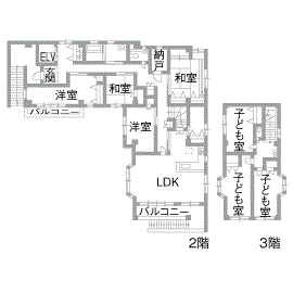 二世帯でうまく住み分け、夫人が家事や作業中でもお子さんの様子がわかる間取りにしたいとのご希望でした。