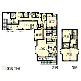ご実家の鉄骨3階建てに親御さんと仲良く暮らすKさんだが、家に合わせて空間を使い分けていた。そのため動線が悪いなどの不便も多かった。それがリフォームのきっかけに。 まず世帯ごとに空間を分け、2階の一部と3階を子世帯スペース、新たにキッチン、トイレ、バスルームを設けた。内装は夫人好みの白を基調に木目を効かせて爽やかな雰囲気に。以前は生活空間と離れていた夫人の作業スペースをリビング横に設け、キッチンからの視界も考慮し、作業や料理をしていても子どもの様子がわかるようした。 3階は2居室を一体化し広々としたWICを備えた主寝室に変更。親世帯とは扉一枚で行き来でき、食事は今まで通り一緒にと、程よい距離感の二世帯住宅が完成した。