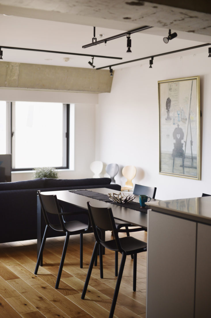 間仕切りをすべて撤去し、見事な眺望が楽しめる場所をリビングに。素晴らしい夜景はさることながら、「日中は流れる雲を眺めるのが好き」と昼夜を問わずお気に入りのスポットとなった。床は無垢材を用い、壁は塗装仕上げ。一部をコンクリート打放し壁にして、窓枠やライティングレールの黒が差し色に。男前なカッコいい空間となった。