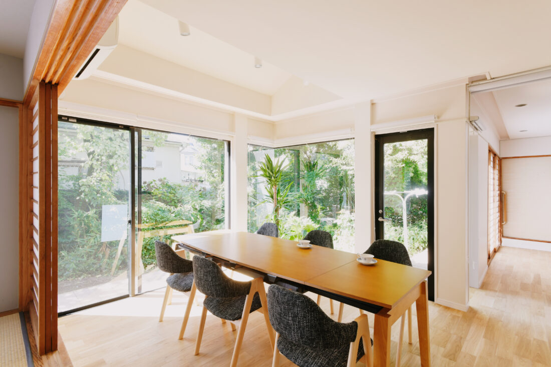 広々としたキッチンはサイズをコンパクトにし、作業同線が効率よくなるように設計しました。庭が大好きな奥さまが、明るい庭を堪能できるようにしています。残ったスペースは勝手口への動線に収納を配置し、ゴミ箱などは見えない場所に収めています。 ダイニングの照明も一新してスポットライトとダウンライトで明るくなりました。続きの和室にはイサムノグチの照明をつけています。明るくなったLDKではお子様が訪ねてきて、一緒にご飯を食べて過ごせる時間がつくれるようになったそうです。