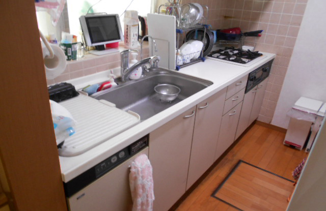 ホーロー素材で掃除しやすさ抜群のタカラスタンダード:レミューに交換。ワークトップのホワイトが照明を反射しキッチンを明るく見せ、扉のローズ色で華やかさをプラス。思わず立ちたくなるキッチンとなりました。