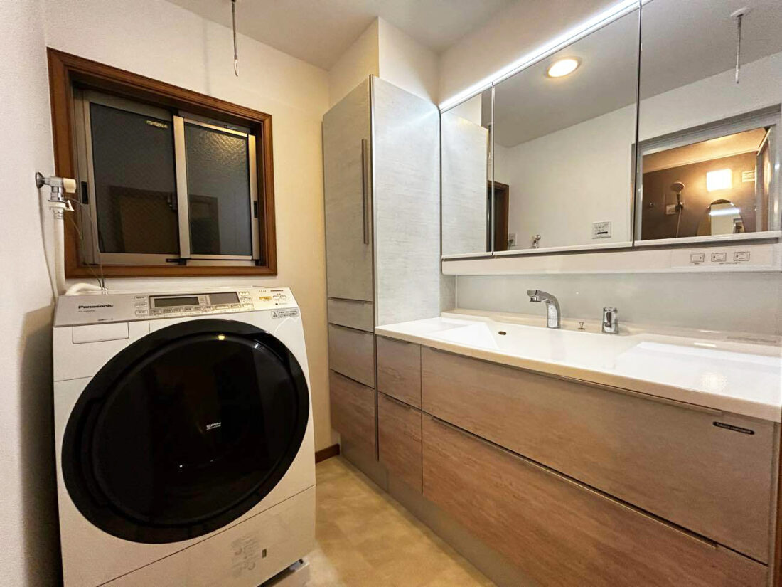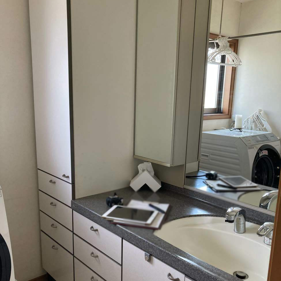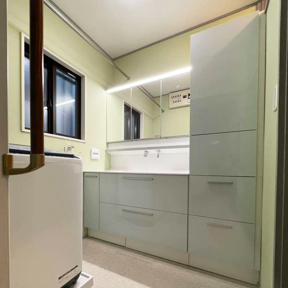ホーロー洗面台「エリーナ」にリフォーム。広いカウンターと大きな鏡で身支度しやすそうですね。収納もたっぷりあって、すっきりと使えます。