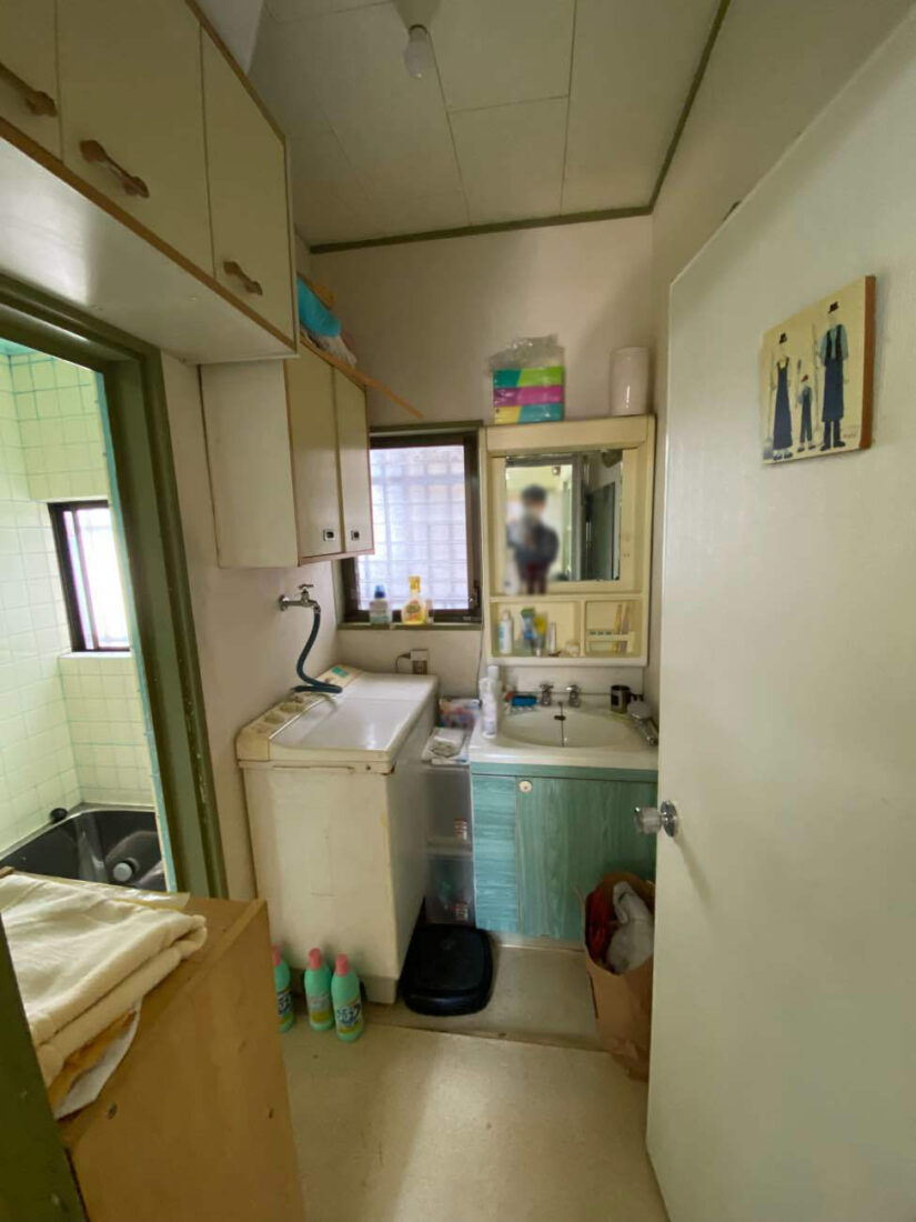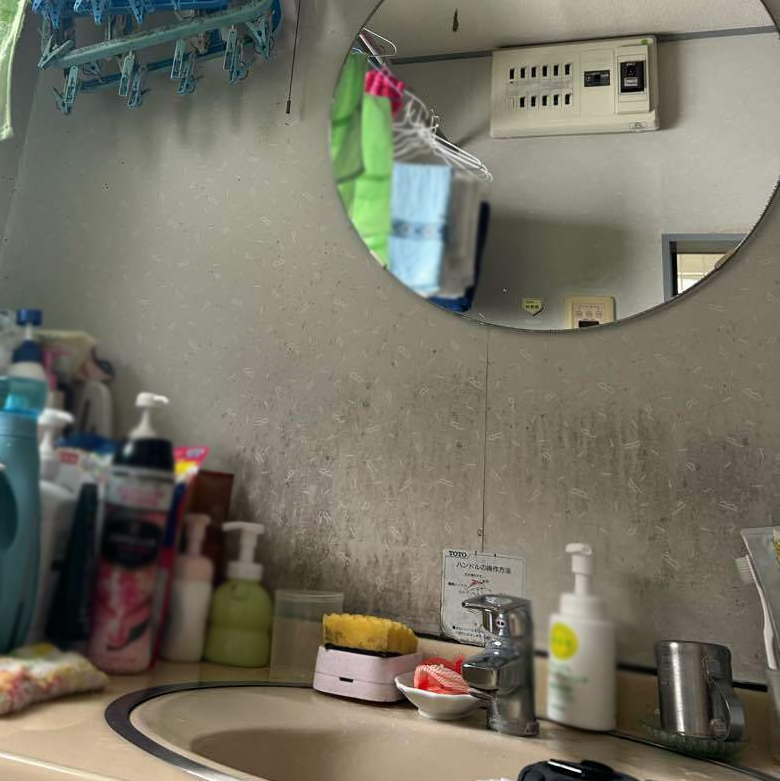 - 洗面台:無垢の木の洗面台(ウッドワン) 壁:RE53019(サンゲツ) 洗面台まわりの壁:エマウォール(タカラスタンダード) 床:PST3028(東リ)