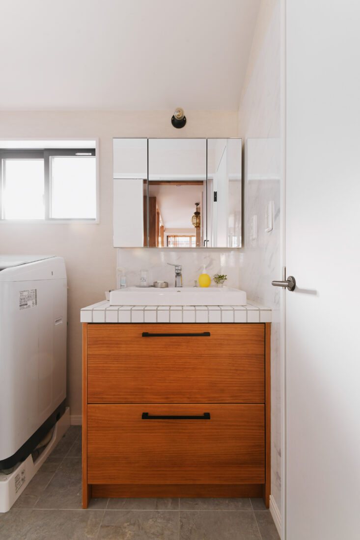 ミッドセンチュリーモダンのイメージに合うように何度も検討を重ねた照明がポイントの洗面室。洗面台をタイル仕上げにし、フロアタイルの重厚感と釣り合う雰囲気に。洗面台まわりの壁には、汚れがつきにくく落としやすいエマウォールを施工しました。