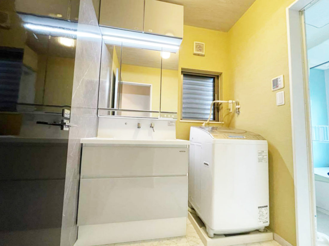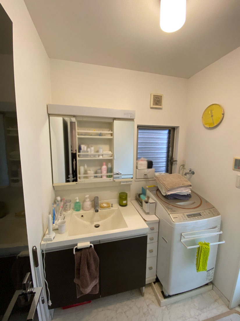 身長が高いご家族に合わせて既存より高さのある洗面台へ交換。吊戸棚も設置し収納量をアップさせました。