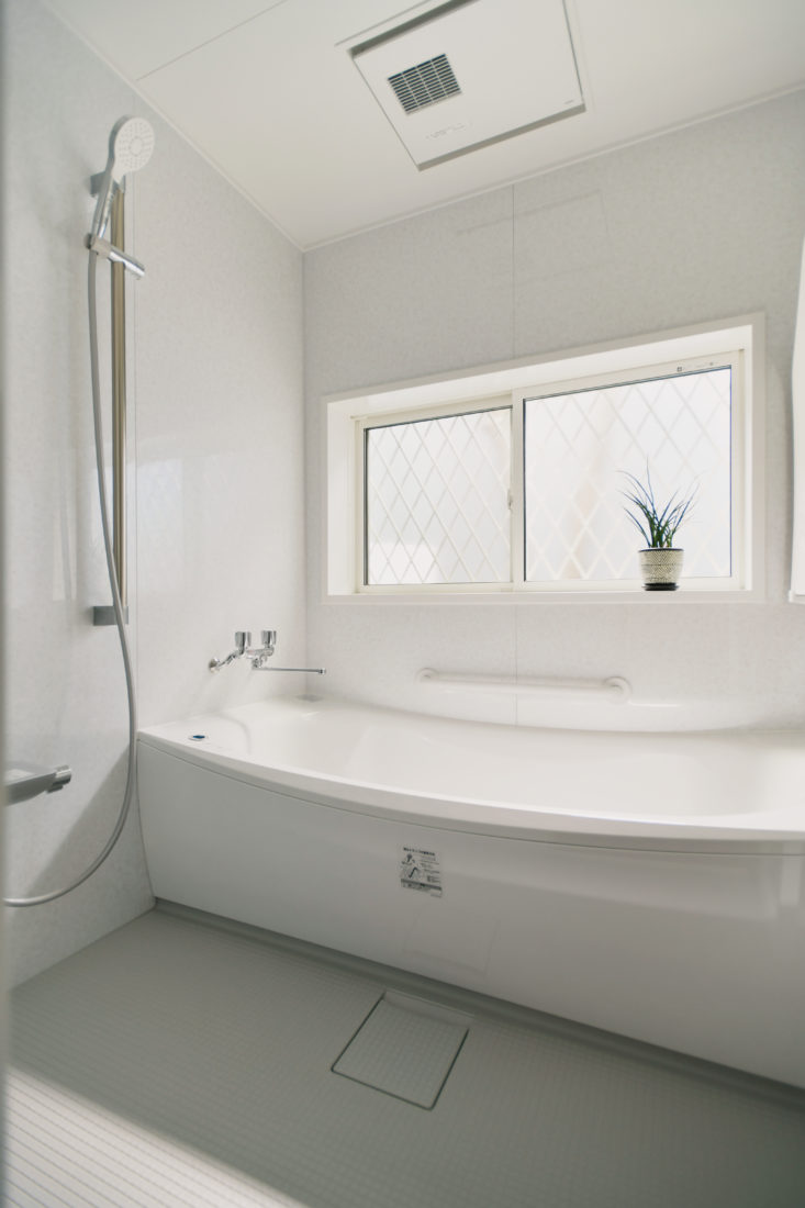 白一色の明るく清潔感のある浴室。白は空間を広く見せる効果があり、開放感も味わえます。浴槽はゆりかごのような形で、全身を包み込むような入浴感が特徴のクレイドル浴槽を選びました。