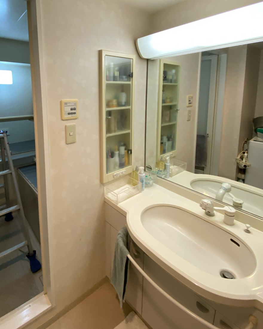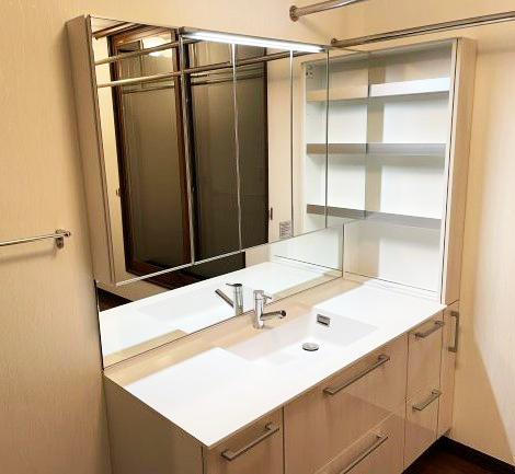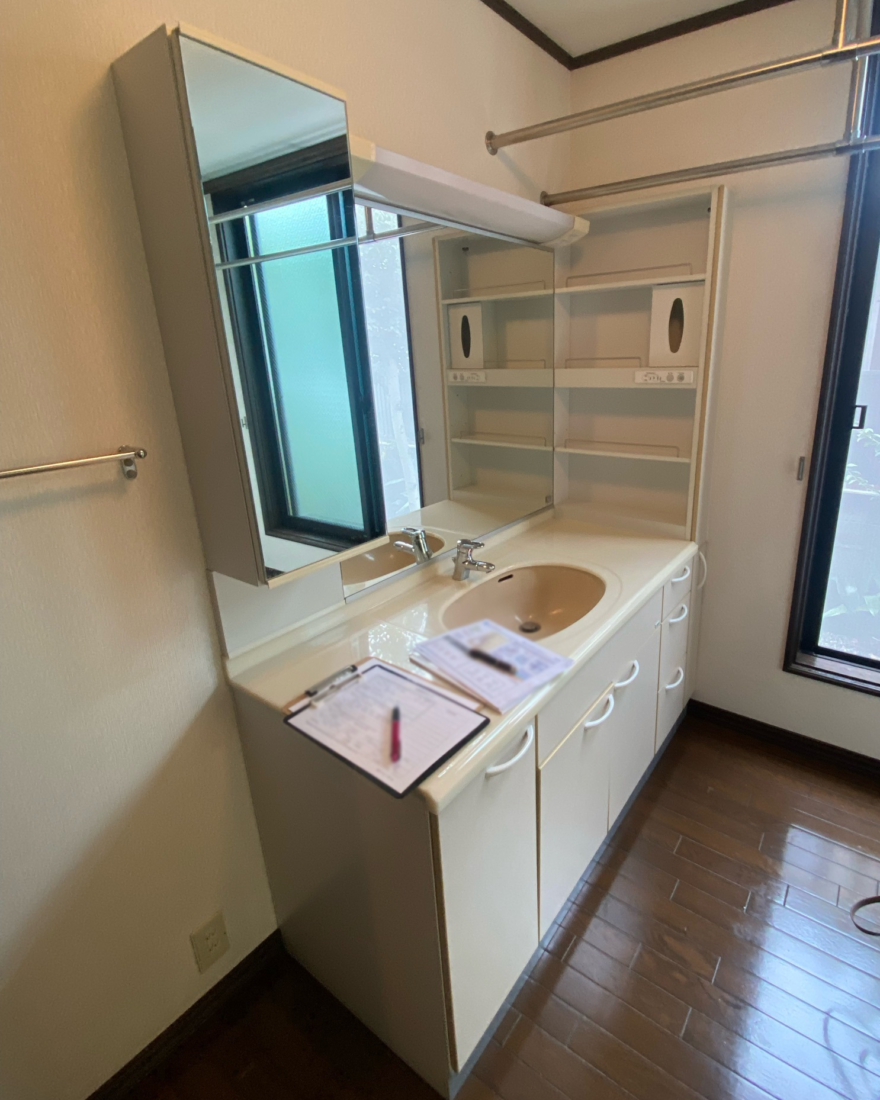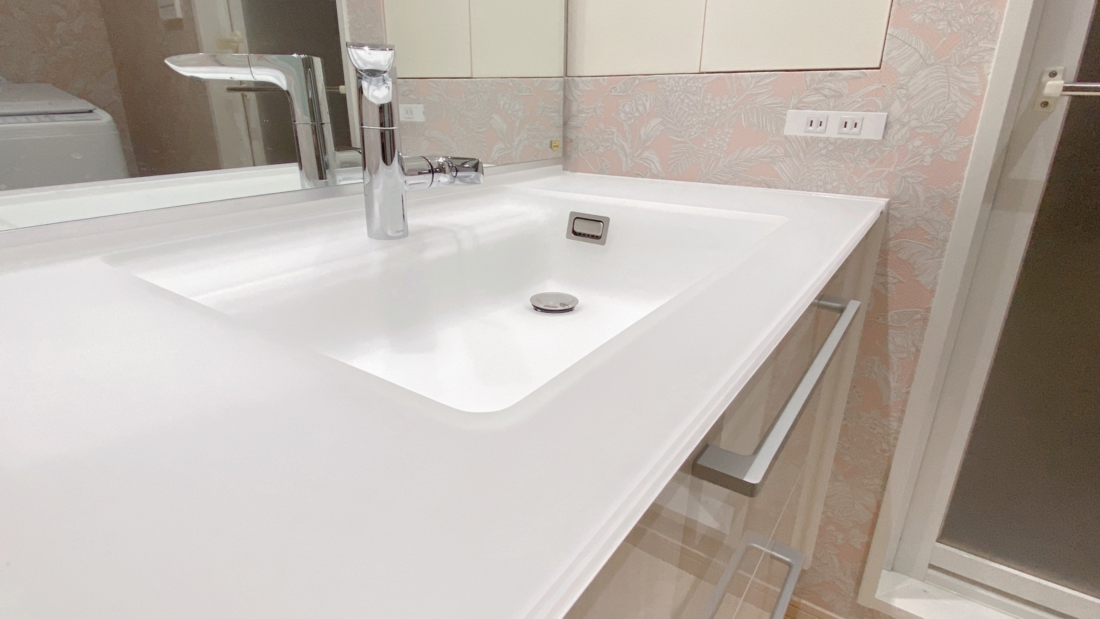 洗面台が水漏れしている状態だったため、新しく交換しました。既存の洗面台より小さくなりましたが、深く広い設計かつ両サイドに物置スペースがある洗面ボウルは使い勝手抜群です。