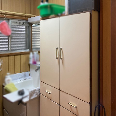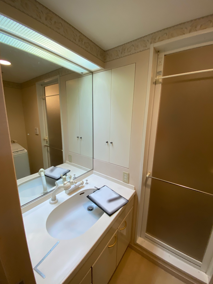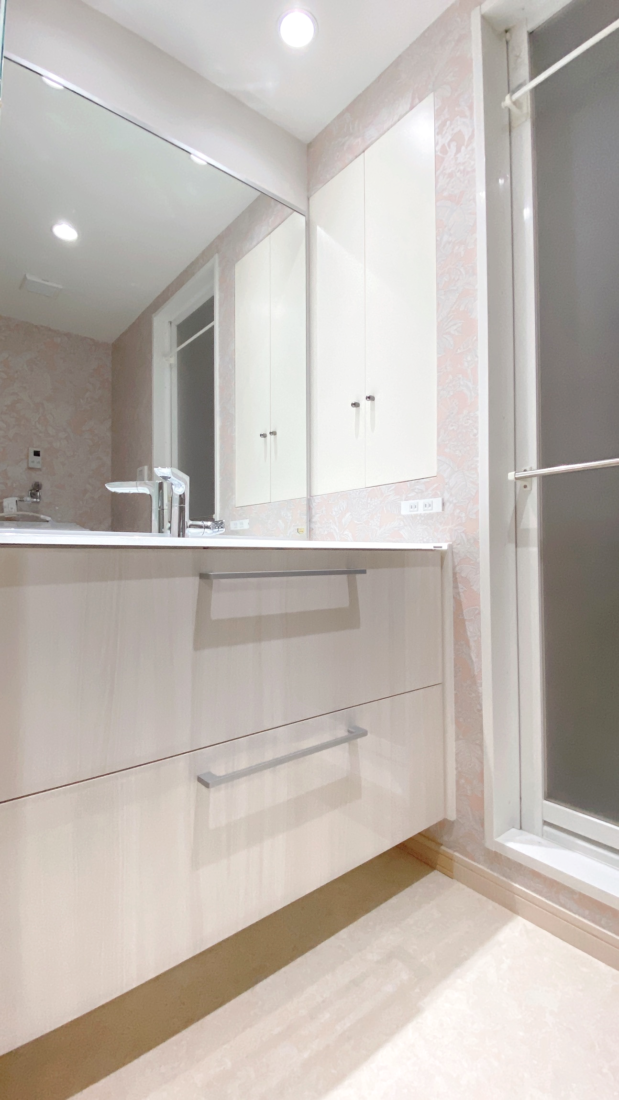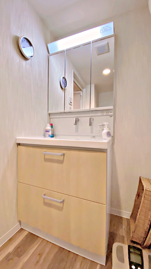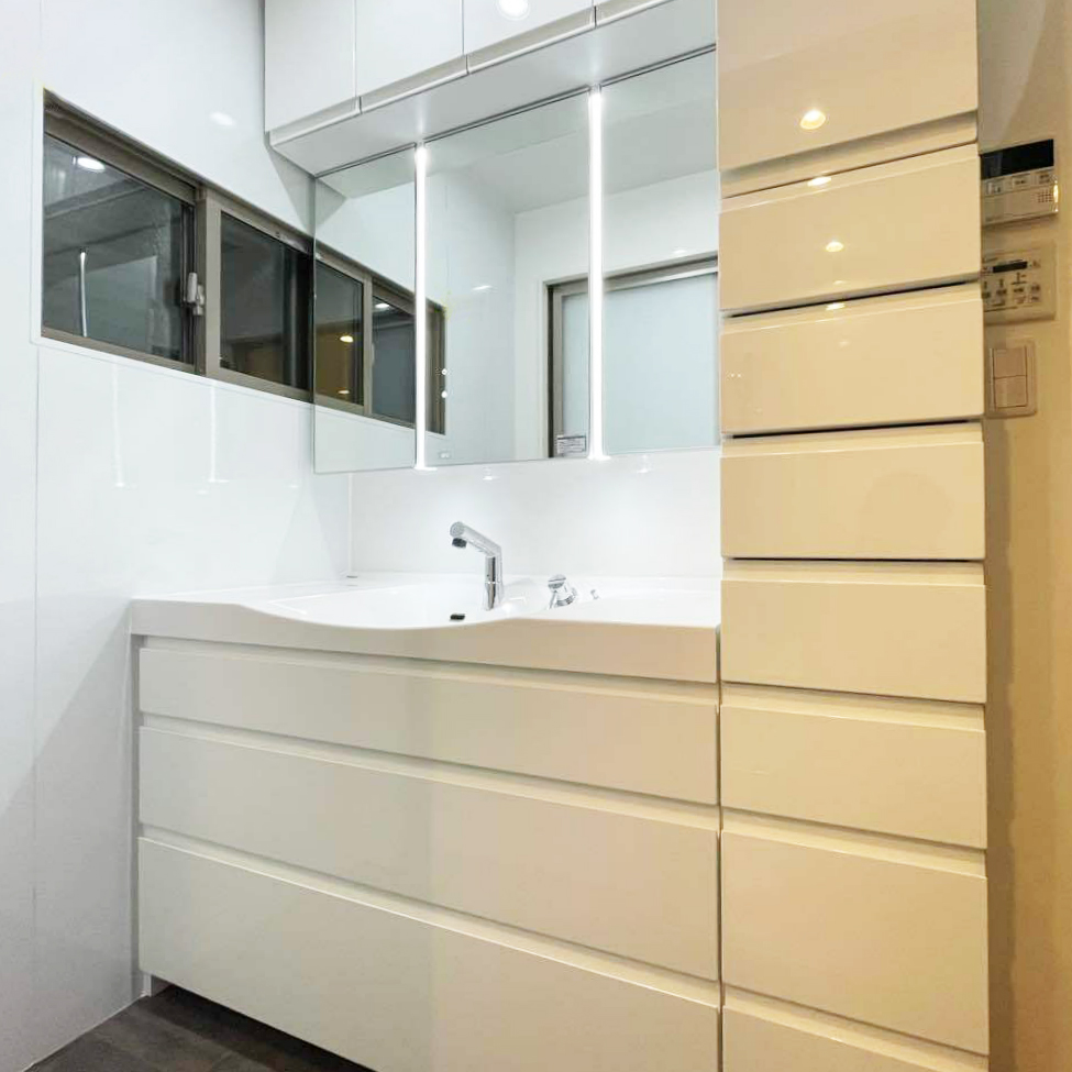 洗面台が水漏れしている状態だったため、新しく交換しました。既存の洗面台より小さくなりましたが、深く広い設計かつ両サイドに物置スペースがある洗面ボウルは使い勝手抜群です。