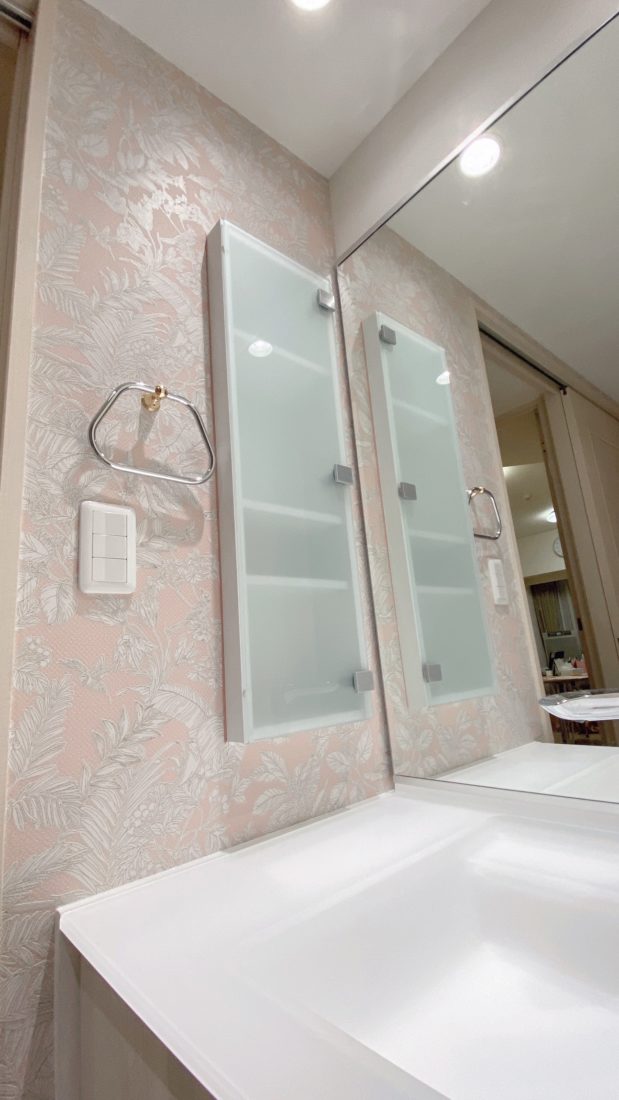 美しいクリスタルカウンターが特徴の洗面台。デザインだけでなく、熱に強く、シミや汚れがつきにくい素材で機能面でも優れています。洗面横はリーフデザインのナチュラルだけど上品さもあるクロスにしました。