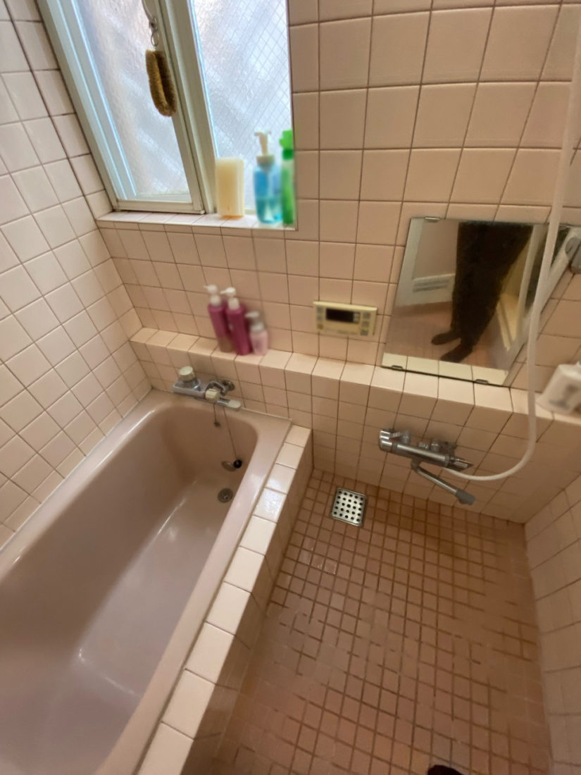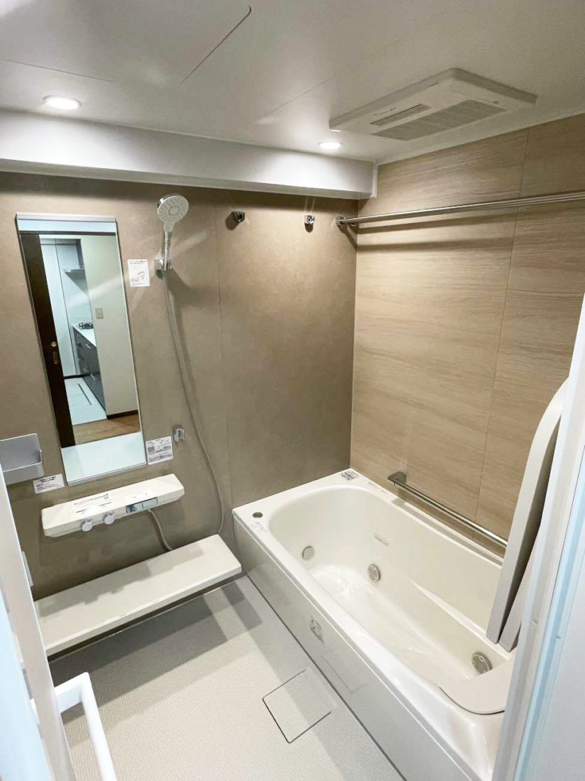 段差を無くし入りやすくなった浴室。スペースを拡張したため、広くゆったりした空間に。素材感が異なる、ベージュを基調とした2種類のカラーを組み合わせ、デザインの違いを楽しめる浴室になりました。