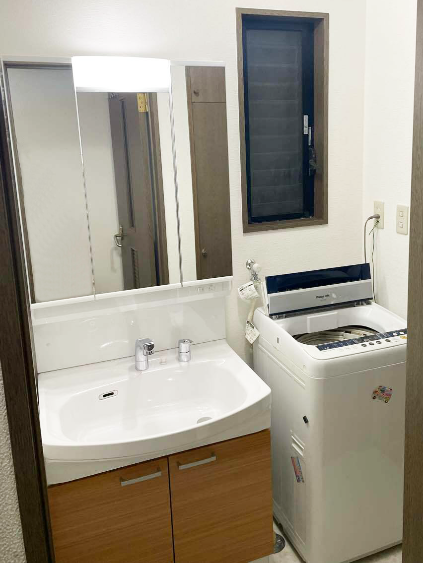 奥行きが浅く限られたスペースでも設置可能な洗面台。コンパクトな分、三面鏡の裏には大容量の収納スペースがあります。洗面ボウルはホーロー素材なので、汚れがキズがつきにくくお手入れが簡単です。