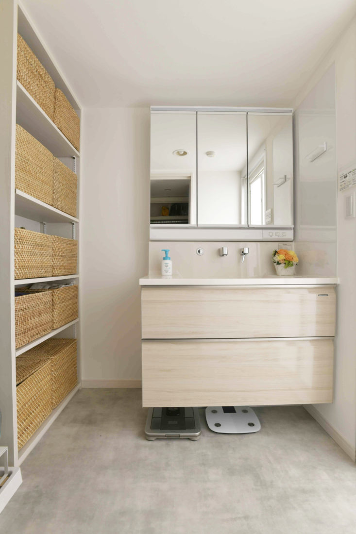 既存の洗面台よりスリムな洗面台に交換。その代わり洗面台脇にオープン収納を作り、収納量は大幅アップ。リフォーム前よりもすっきり収納でき、使いやすい洗面所になりました。