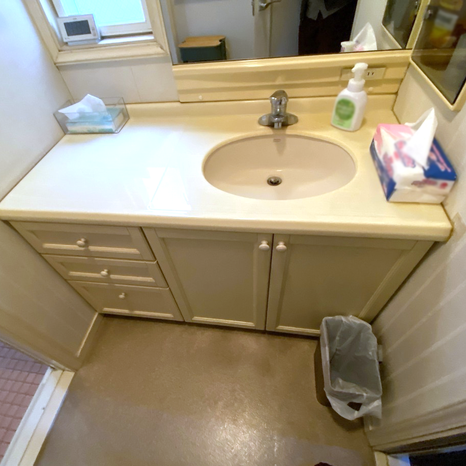 既存の洗面台は収納はあるものの、排水管が真ん中にあり収納しづらい造りでした。今回設置したオクターブスリムは、排水管を奥に配置し収納スペースを広く確保。カウンターは空間にあわせてすき間なく納めスペースをムダにせず、すっきりとした仕上がりになりました。