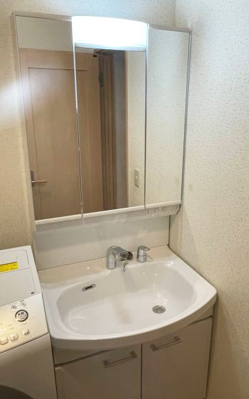 水漏れしてしまった洗面台。新しく交換した洗面台は、キャビネットやミラー裏にたっぷり収納があり以前よりすっきり。LED照明やお湯のムダ使いををカットする水栓など、省エネ対策もバッチリです。