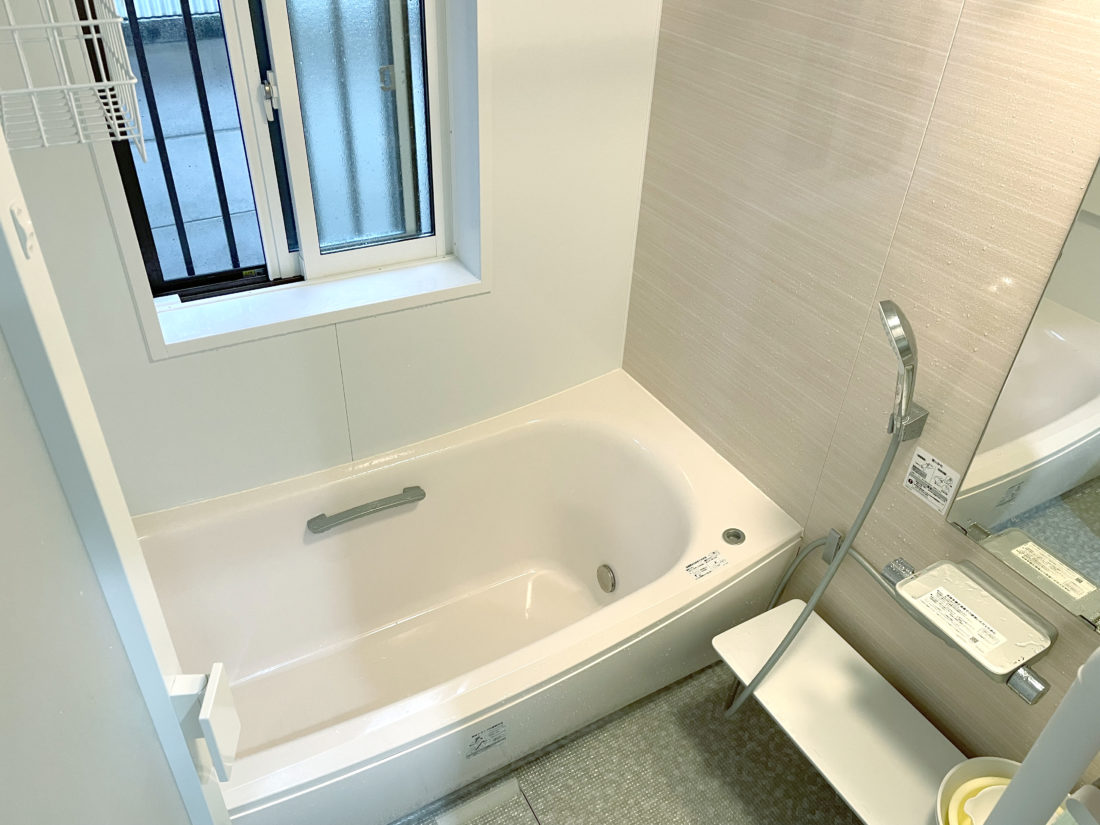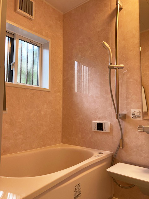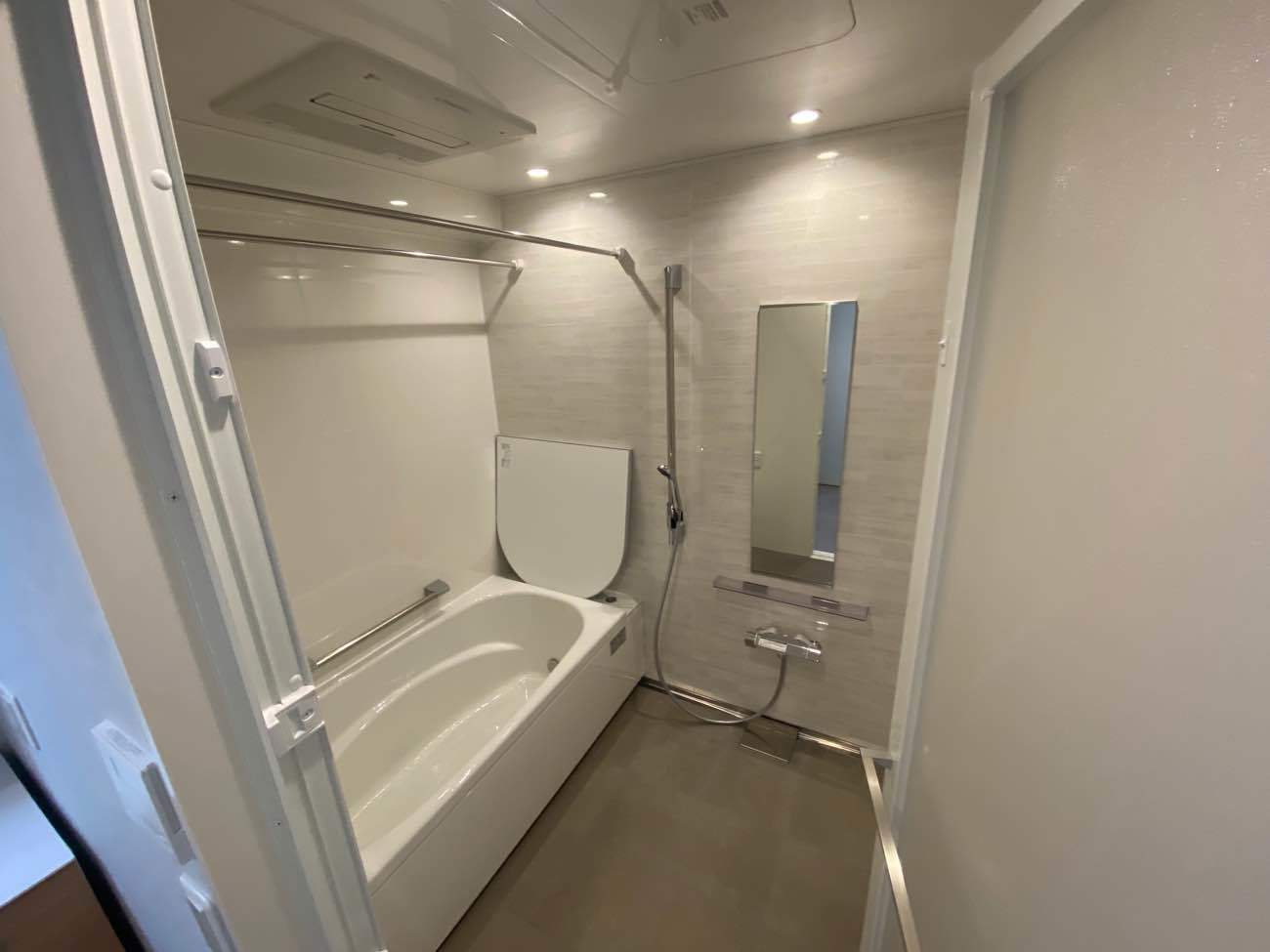 浴室パネルと床をグレー系でまとめ統一感を出しつつ、光沢のある天井に照明が反射して空間を明るく見せてくれています。あたたかさを逃がさないように浴室全体を保温材で完全防備!これで冬でもゆっくりあたたかいお風呂に入れますね♪