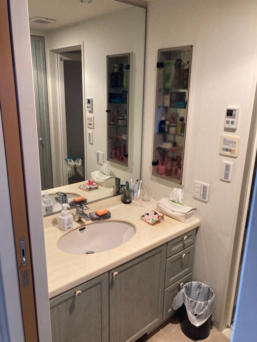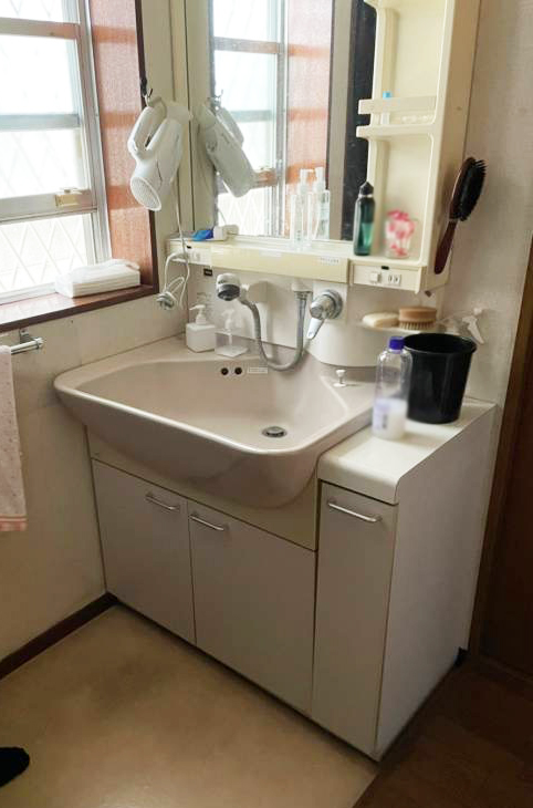 鏡裏に収納がたっぷりある洗面台を設置したことで、今まで見えていた洗面グッズをまるっと収納!洗面ボウルは水アカが溜まりやすい隙間がない一体型で、お手入れも簡単です。
