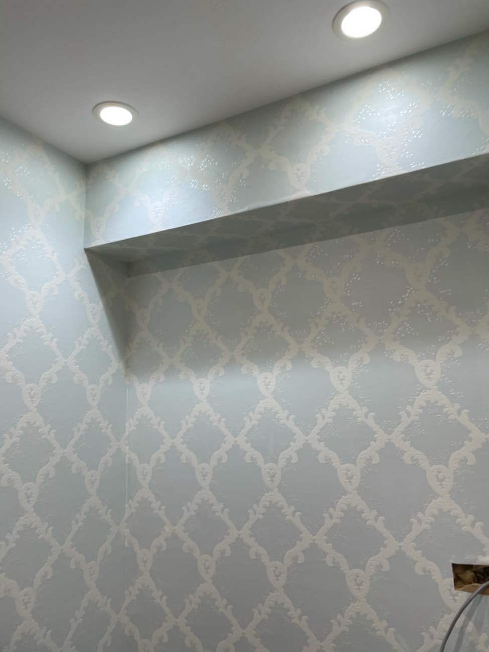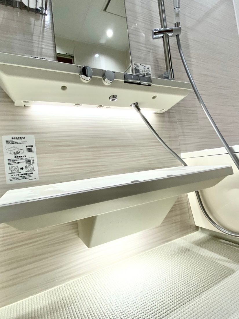 手元の収納にはよく使う小物を入れるスライドポケット付き。探す手間が省けてすっきり収納できます。洗面台横の壁には衝撃・キズ・水・熱に強いメンテナンスが簡単なパネルを貼りました。