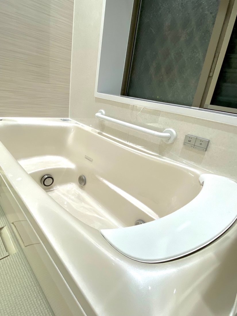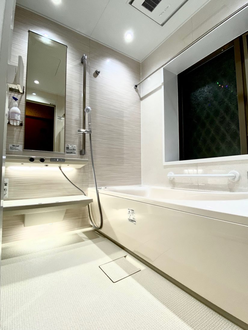 お部屋の真ん中にユニットバスを増設!浴室はモノトーンでまとめ高級感のある落ち着いた雰囲気に。内装は箱根の旅館をイメージした和モダンな仕上がりになりました。