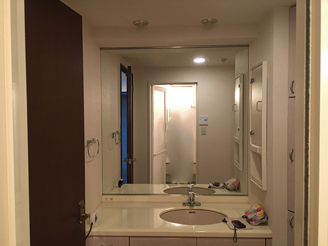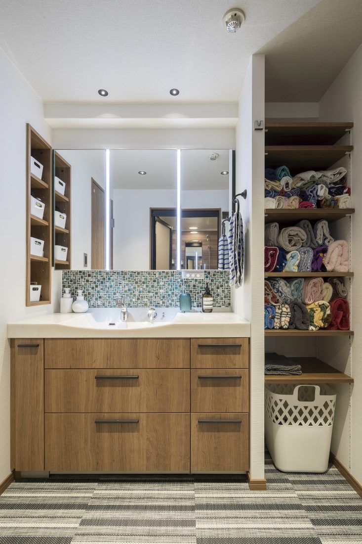 一面鏡から元々あった収納は使い難いため撤去し、新しく可動棚を設置しました。洗面台やドア色と合わせて棚も造作しました。洗面台と鏡との間に使用したモザイクタイルも良いアクセントになっています。