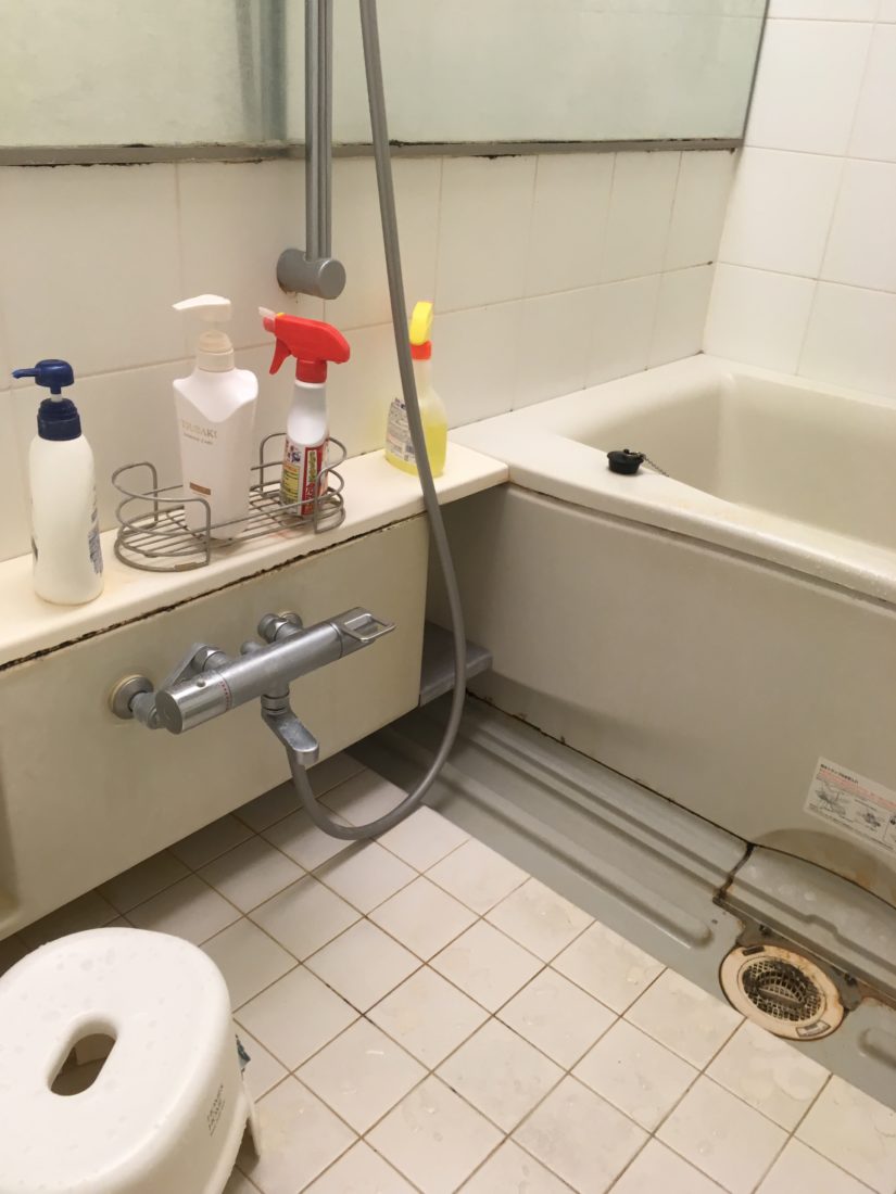 お手入れしづらいのが悩みだった旧式のユニットバスをリフォーム!浴槽は中はホワイト、外はブラックでモノトーンに。山桜をモチーフとしたゆったりとした木目調の「プラナスブラウンウッド」のアクセントクロスが空間を柔らかくしています。TOTOのほっカラリ床は翌朝にはカラリと乾くため、お悩みだった清掃面も解決♪