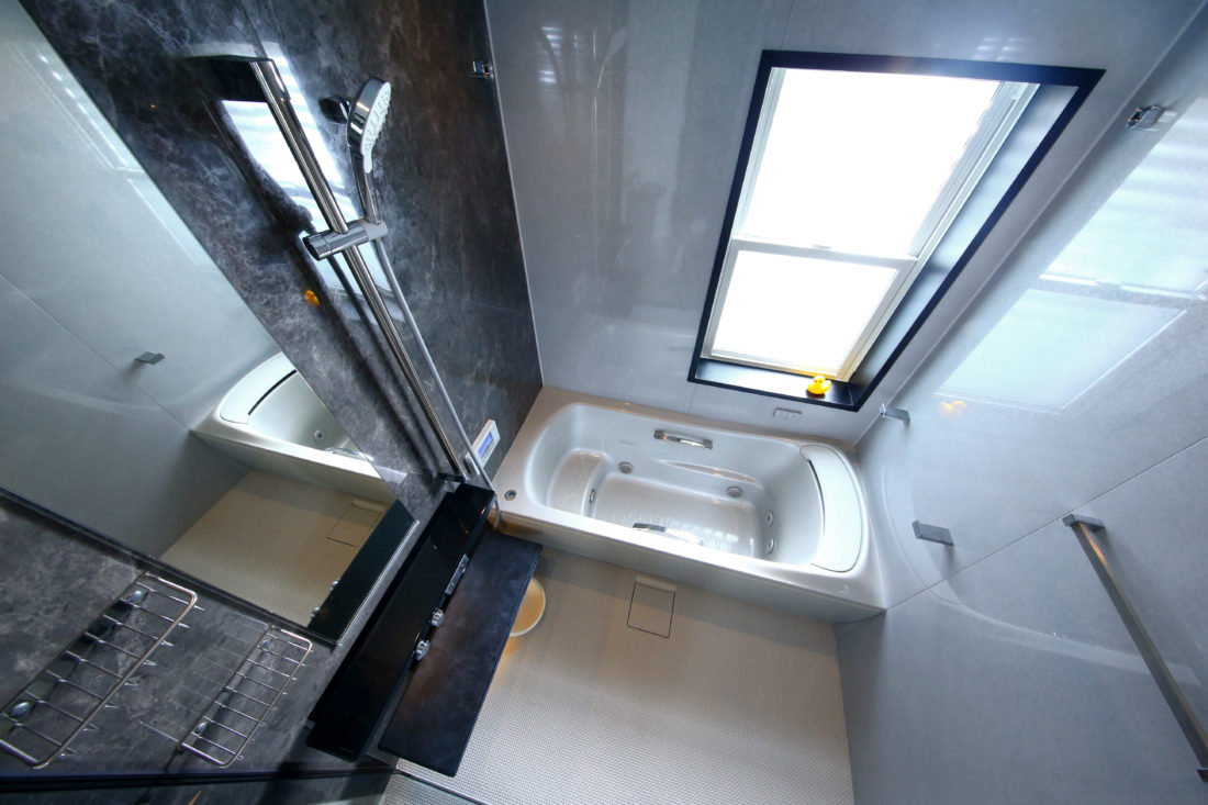 ゆっくりくつろげる1坪サイズのユニットバスへ。一日の疲れを取る場所だから上品で落ち着いた色合いをチョイス。ピアクレアグレーのアクセントパネルで高級感をプラスしました。