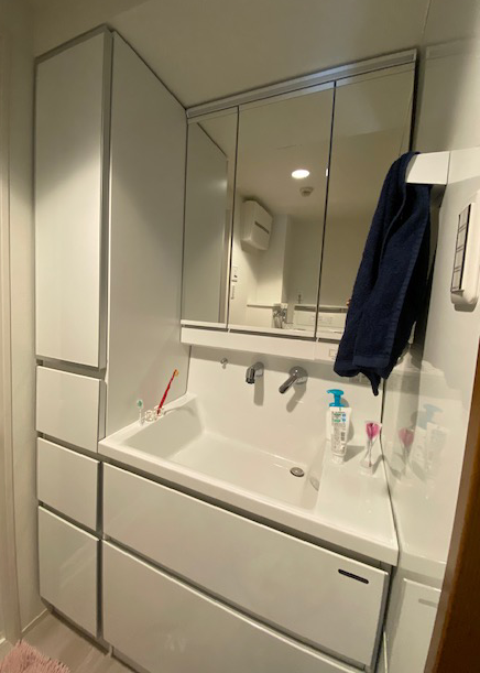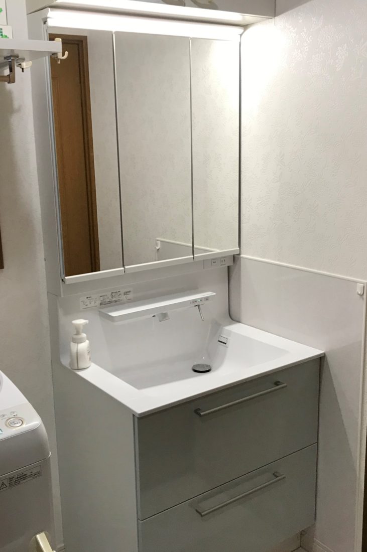 シンプルな洗面台ですが、鏡上のライトが程よく反射して洗面室全体を明るく見せています。広くゆったりとしたスペースにしたことで身支度や洗濯もしやすくなりました。