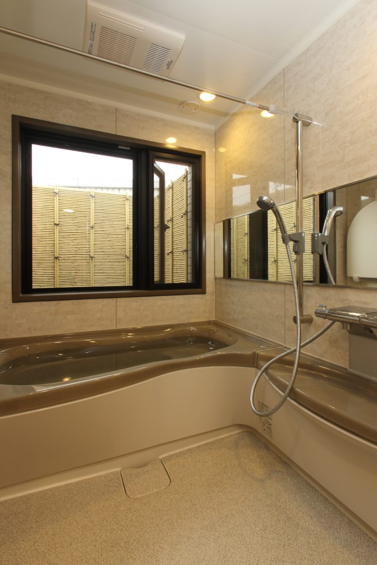 中古住宅を購入してのリフォーム。ポイントのひとつにもなった大きな窓つき浴室は、マンションではなかなか見ることがありません。大きな窓を備えた開放的な浴室に、優雅な曲線を描く浴槽が美しく映えます。