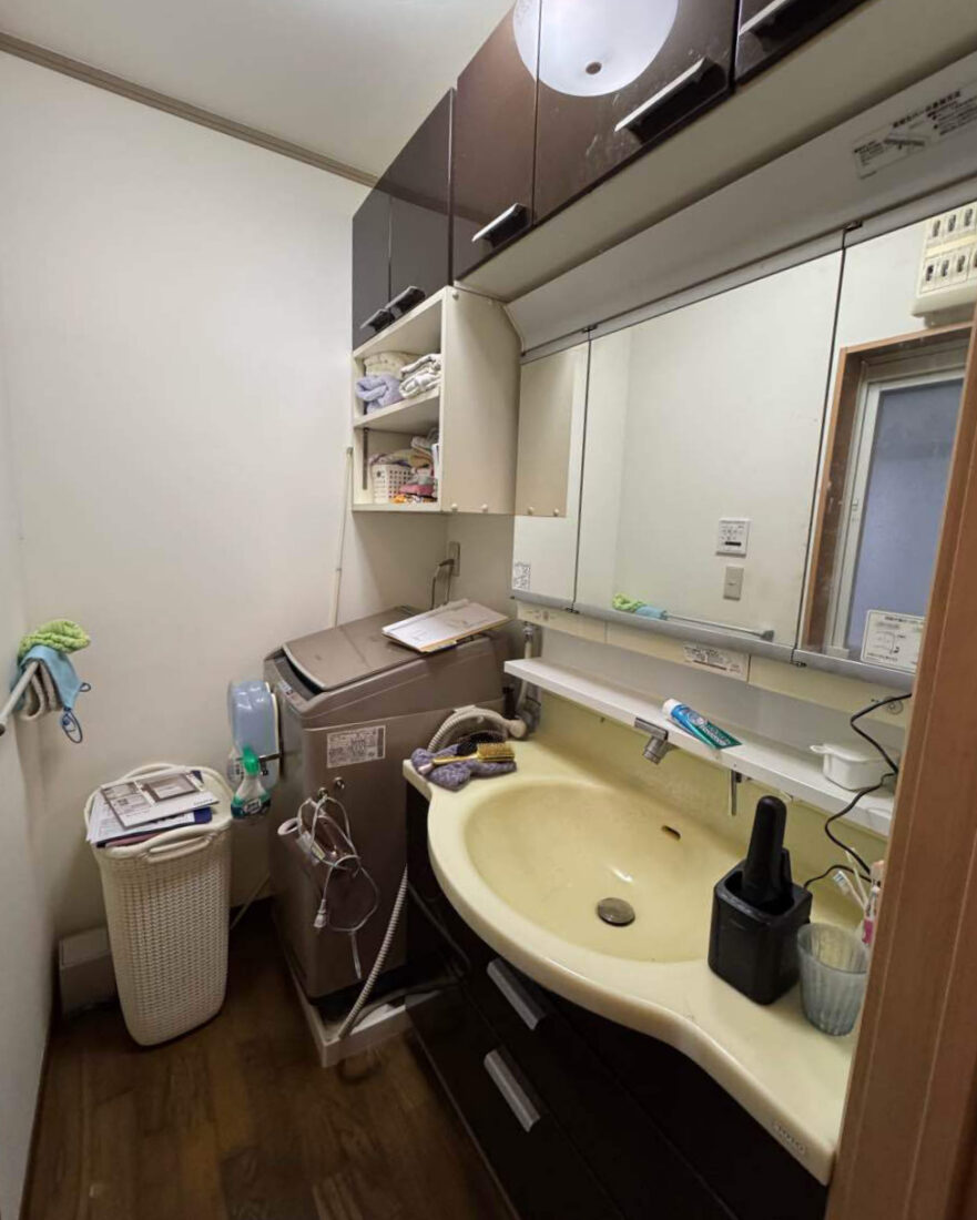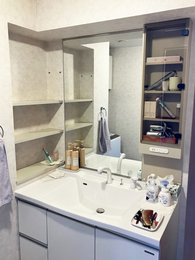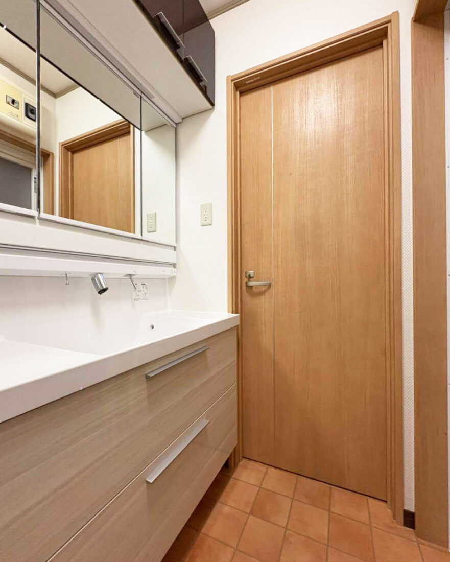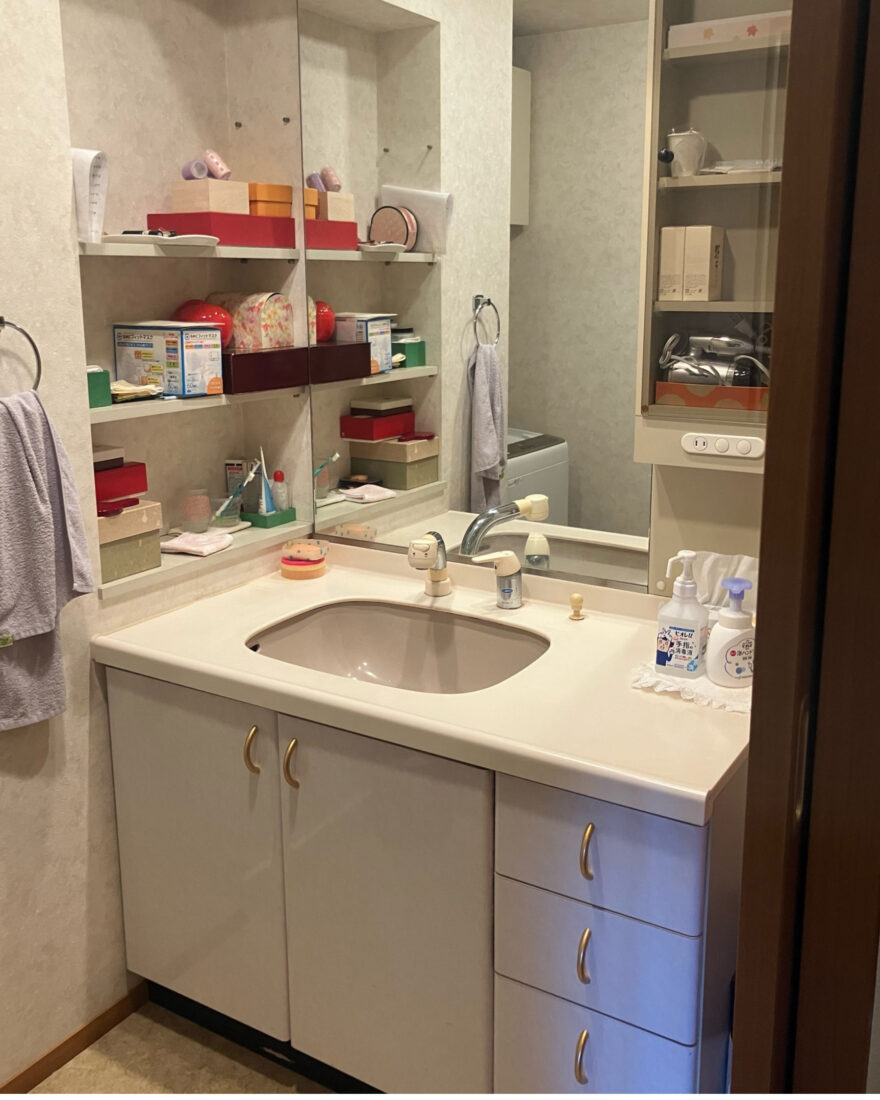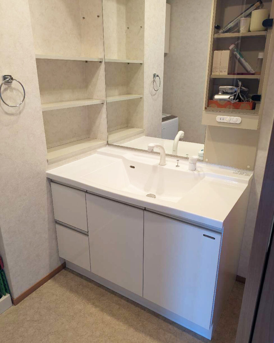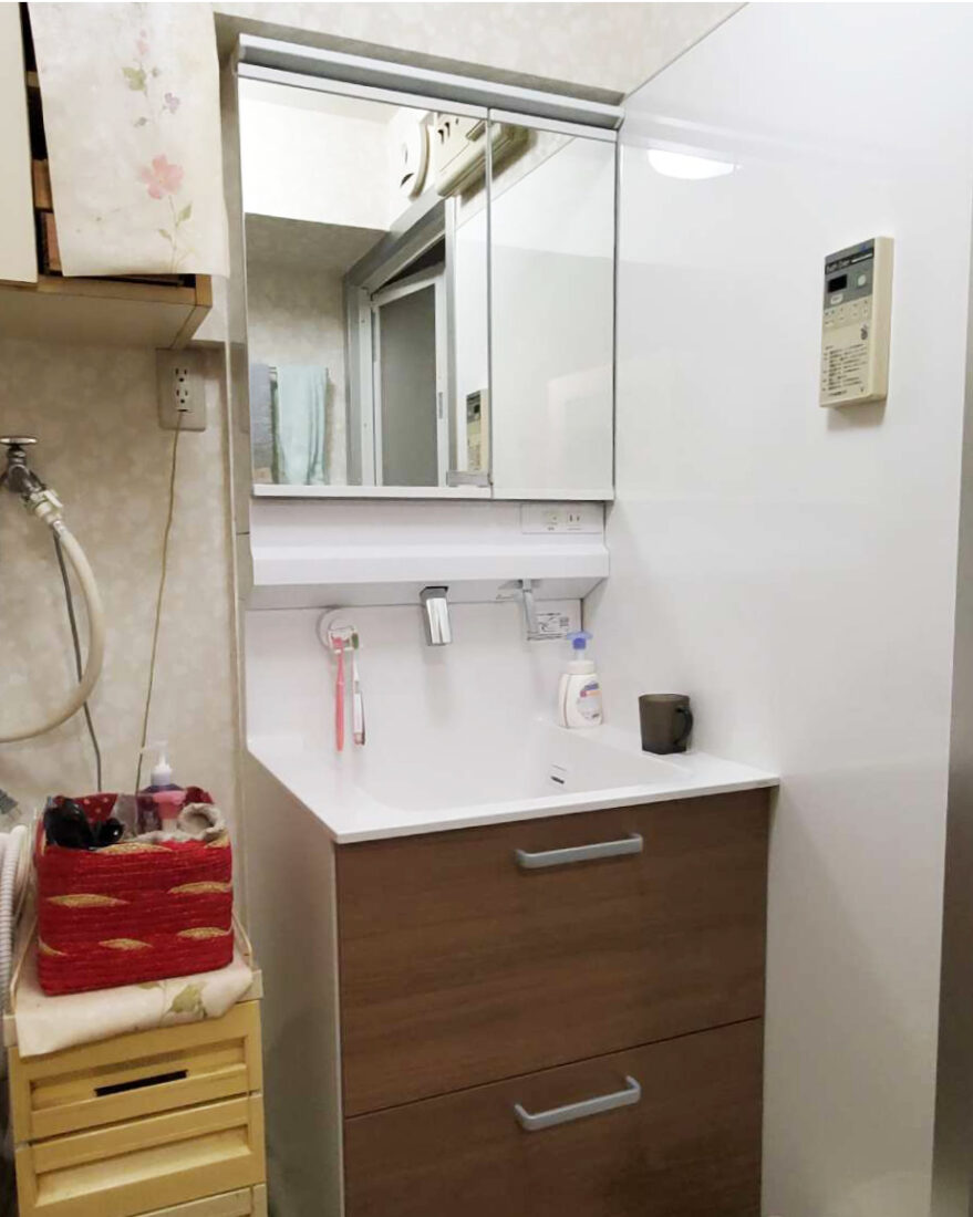 お求めやすさと使いやすい機能が備わった、TOTOのVシリーズへ交換。大きな鏡とLEDライトで、毎日の身だしなみチェックもしやすくなりました。