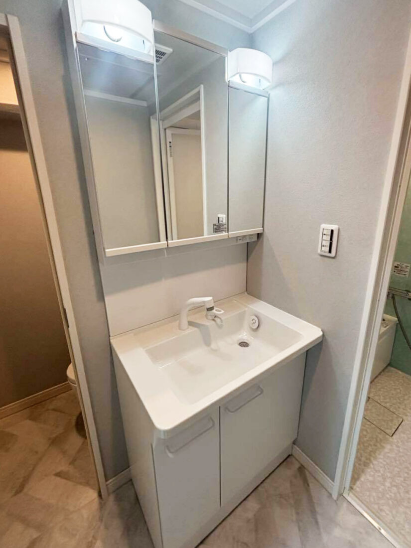 - 洗面台:Vシリーズ(TOTO ) 壁:RE55296(サンゲツ) 床:FS4249(東リ)