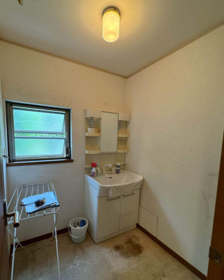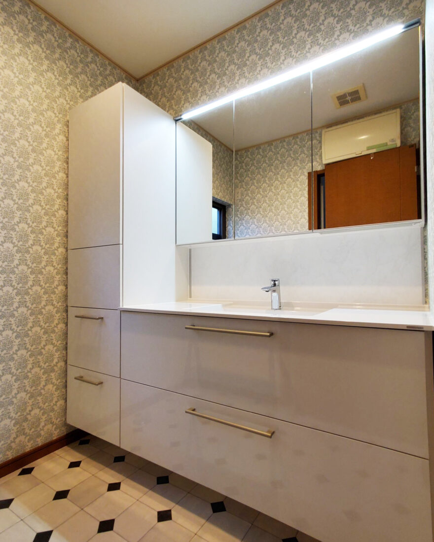 中古物件を購入し引っ越し前にリフォームを行いました。シンプルを追求した美しいデザインのTOTO:エスクアLS。横向きに設置してサイズもアップ!収納もたっぷりです。