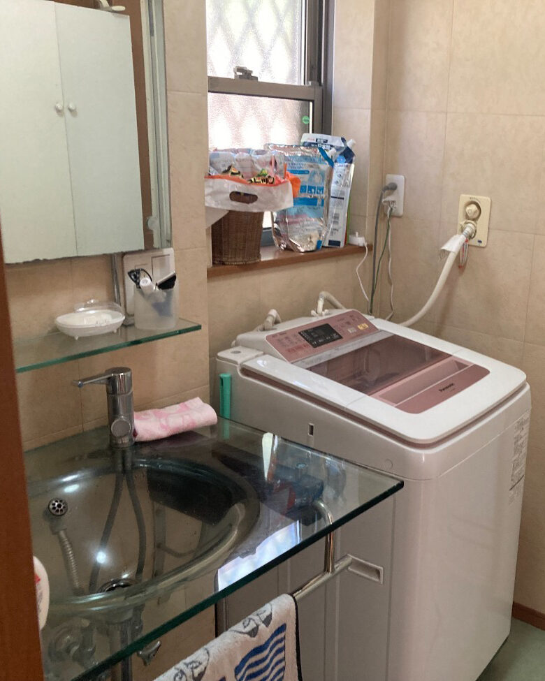 ボウルだけだった洗面台をパナソニックのウツクシーズへリフォーム。引き出し式の収納は奥の物も取り出しやすく、量もたっぷり入ります。鏡は無垢の木の優しい印象のものに。