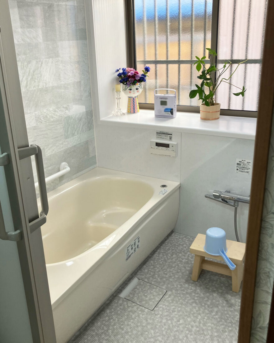 息子様ご家族と同居するため、浴室をリフォーム。畳のようにやわらかいほっカラリ床。滑りにくく、ひざをついても痛くないので、お子さまがいても安心です。自然乾燥で翌朝にはカラリと乾きます。