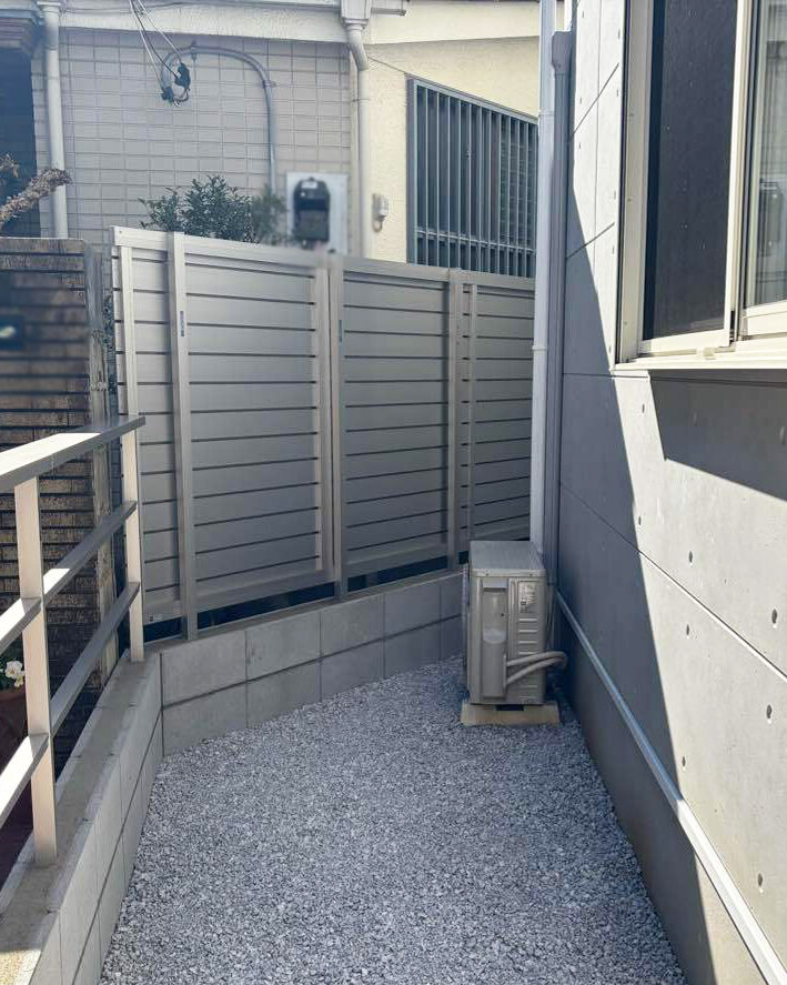 目線が気になる場所はしっかり目隠しできるフェンスを設置。風通しがよく、防犯的に隠れすぎないようにしたい場所は、すっきりシンプルなフェンスを設置しました。