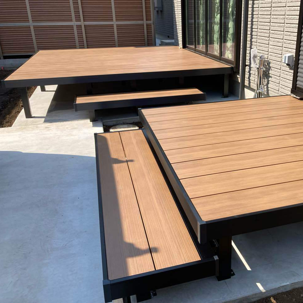 お庭にウッドデッキを設置しました。3仕様の構造から選ぶことができ、シャープで洗練された印象のアルミ幕板仕様に。柱などにアルミ形材を使用しているため、白蟻や害虫などによる被害の心配はほとんどないのがメリットです。