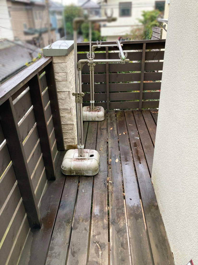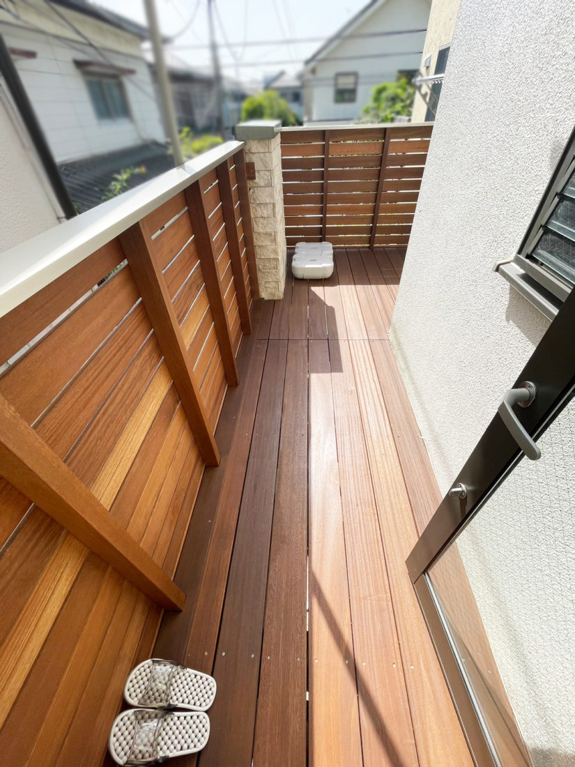 10年以上経過したベランダ。腐食して下が抜けそうな状態だったデッキを硬くて耐久性の高いセランガンバツ材に交換。天然木なので自然な風合いが素敵ですね。ベランダ前にあった植栽は伐採。外からも天然木がしっかり見え、外観のアクセントになっています。