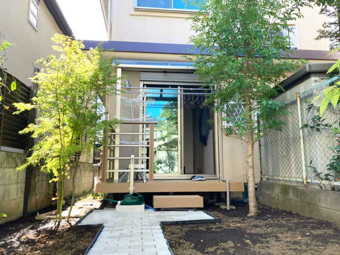 外構工事 東京都 M様邸 2022.08.05 BEFORE AFTER 水はけが悪い芝生をウッドデッキにリフォームしました。 トレンドをおさえた絶妙な色合いはデザイン性抜群。サッシと同じ高さにしたことで出入りしやすくなりました。 卯月ブログでもご紹介しています! →卯月ブログ 商品名 ウッドデッキ(人工木材):樹ら楽ステージ(リクシル) 物干し:ホスクリーン(川口技研) 建物タイプ 戸建て