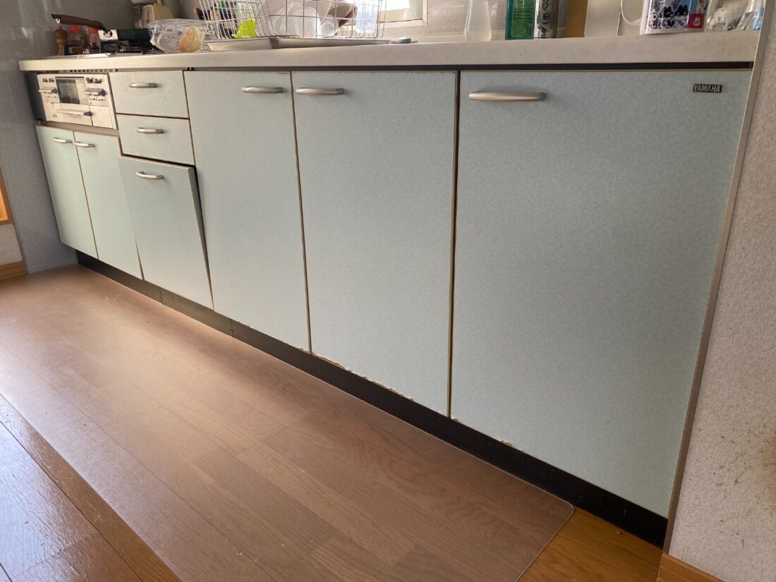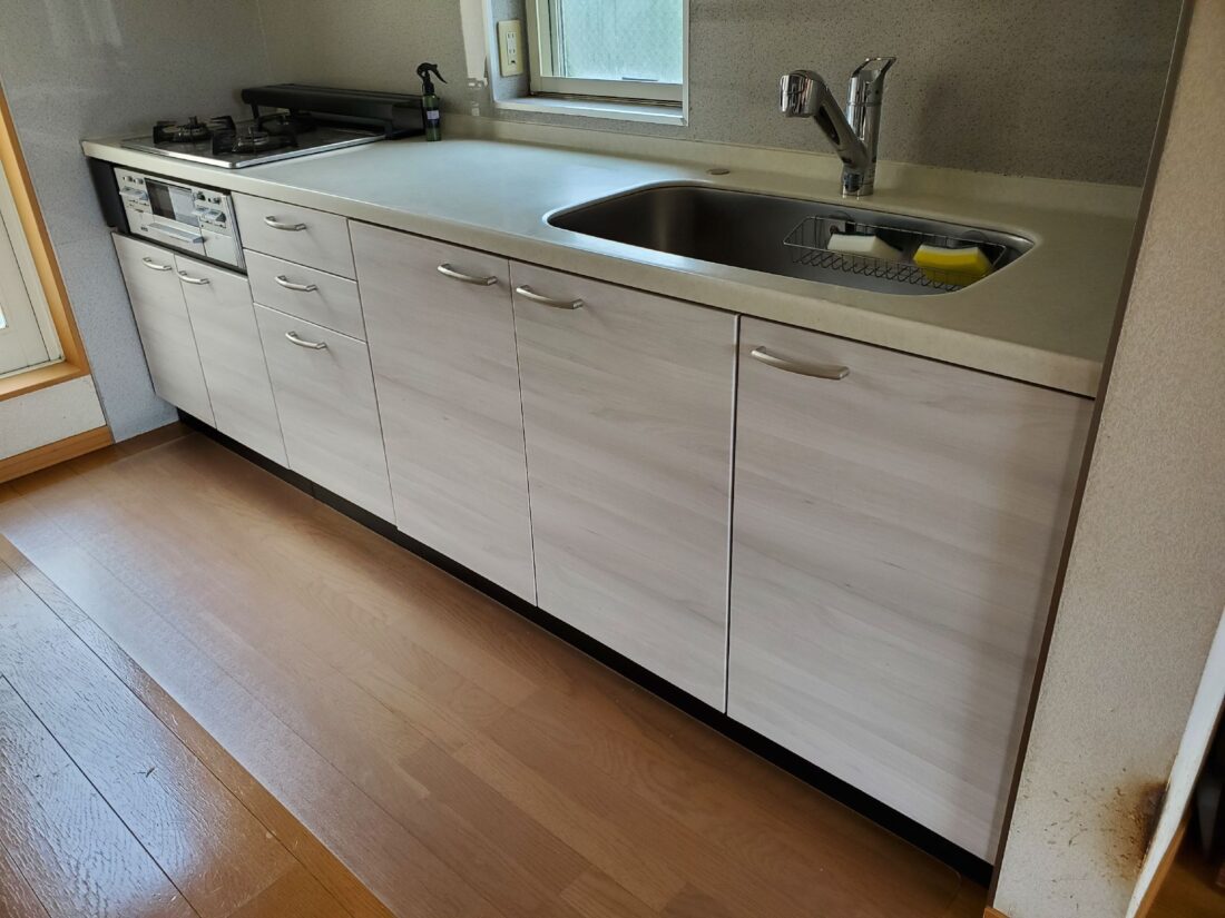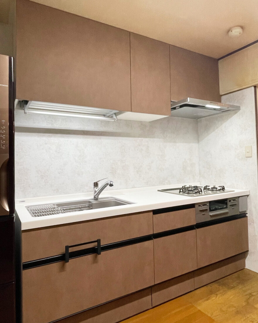 キッチンの扉を明るい木目柄のダイノックシートで貼り替えました。キッチン本体はそのままでも、まるで新品に交換したかのような仕上がりに。空間が一気に明るく、心地よく生まれ変わりました😊