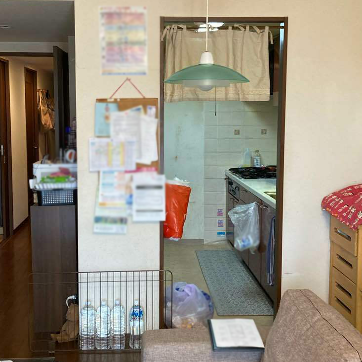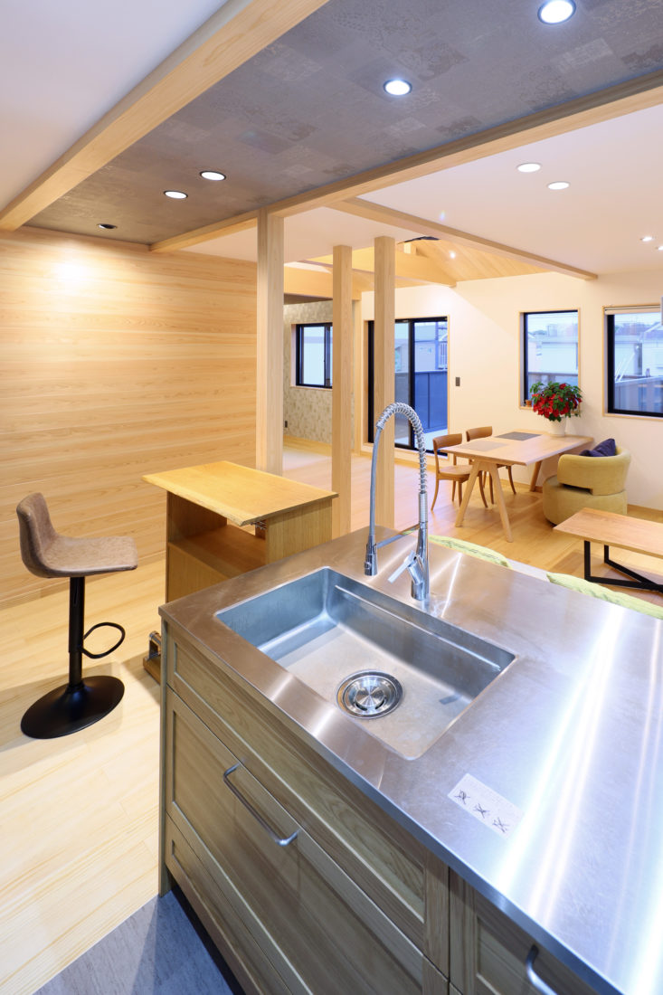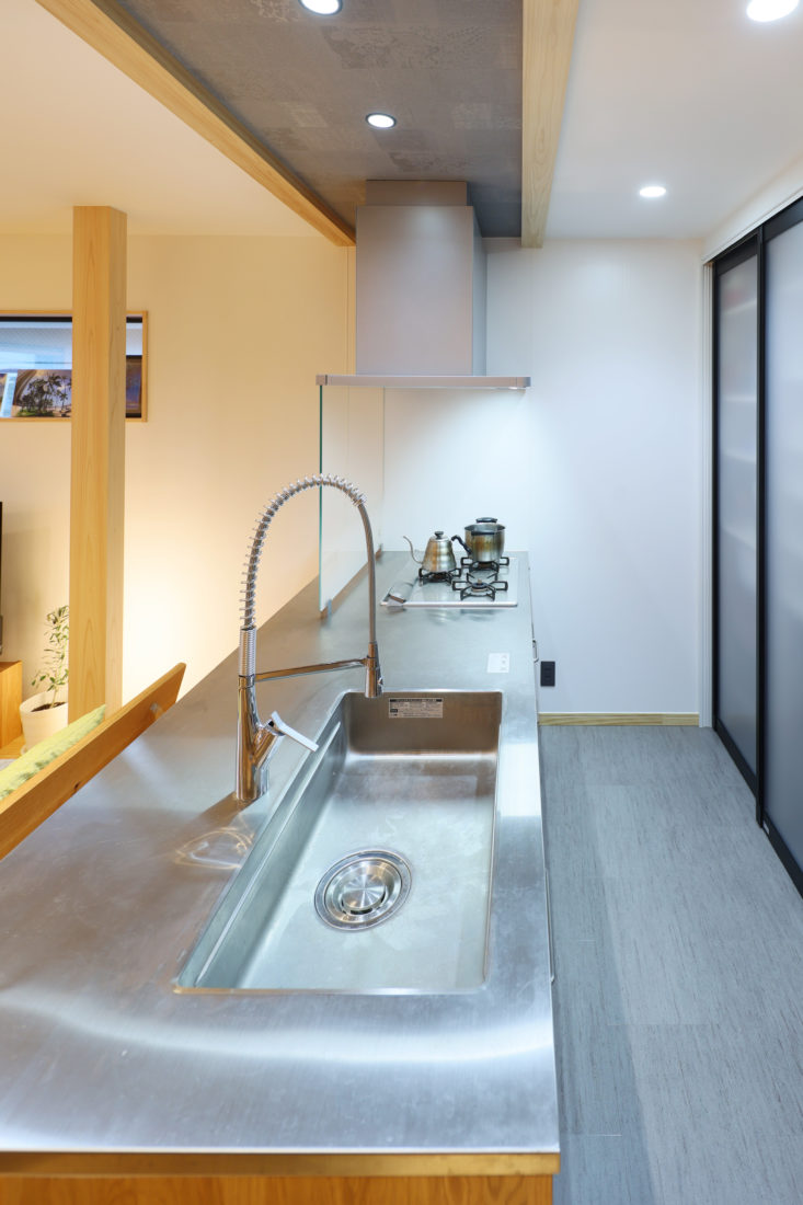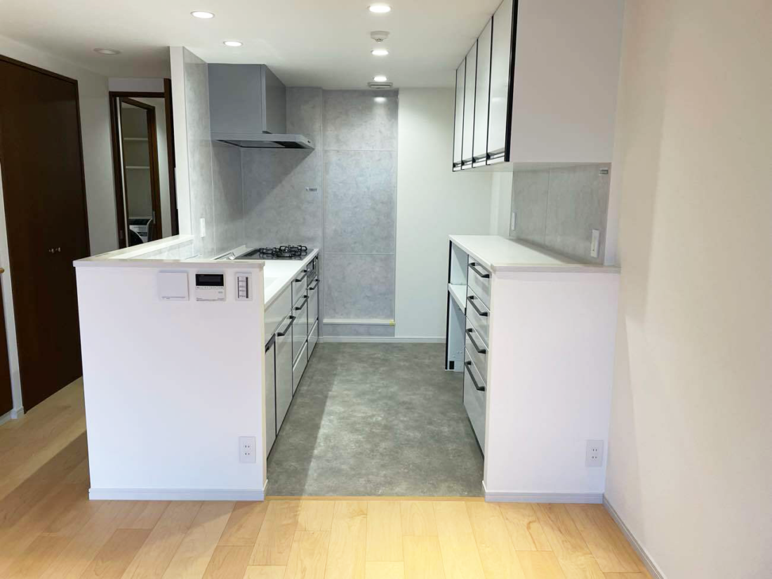 壁に囲まれたL型からウォークスルータイプのI型へリフォーム。TOTO「ミッテ」のシステムキッチンは部屋に馴染みやすいデザインでグレーみがかった木目柄が内装とも調和しています。