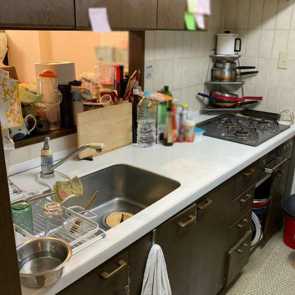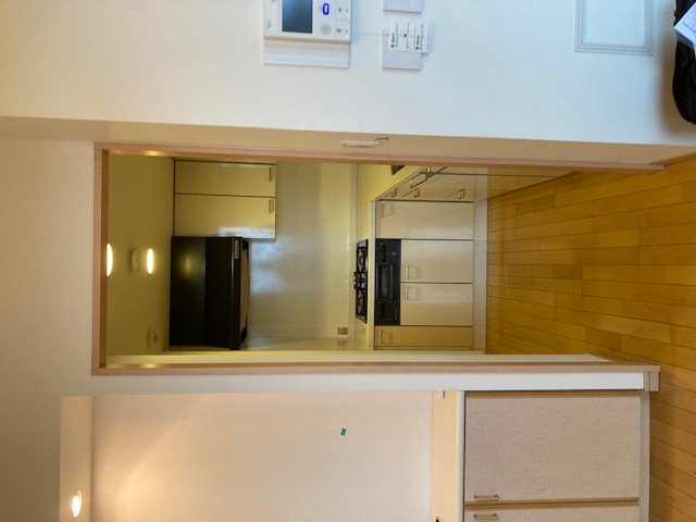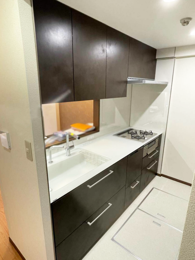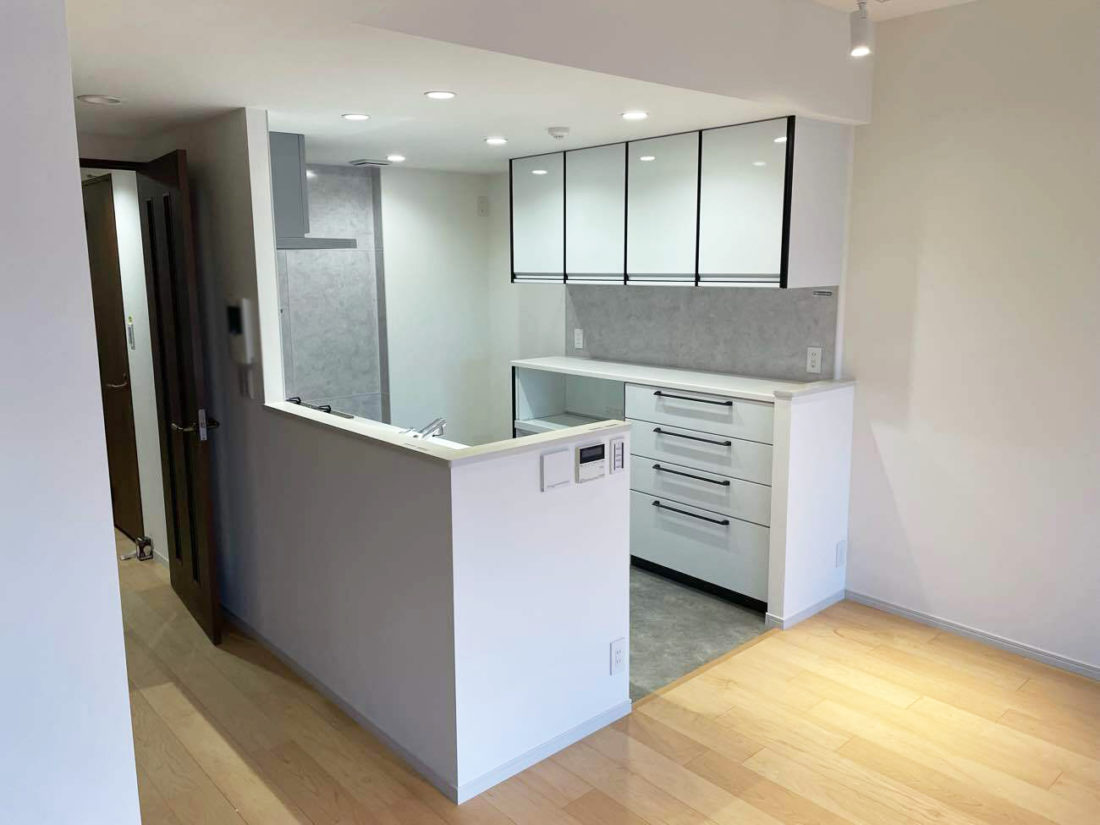 一部壁を撤去し開放的で明るい空間にしました。光沢のあるデザインとホワイトの効果でスッキリ広々と見えますね。ホーロー素材のキッチンは日々のお手入れが簡単で時短になります。