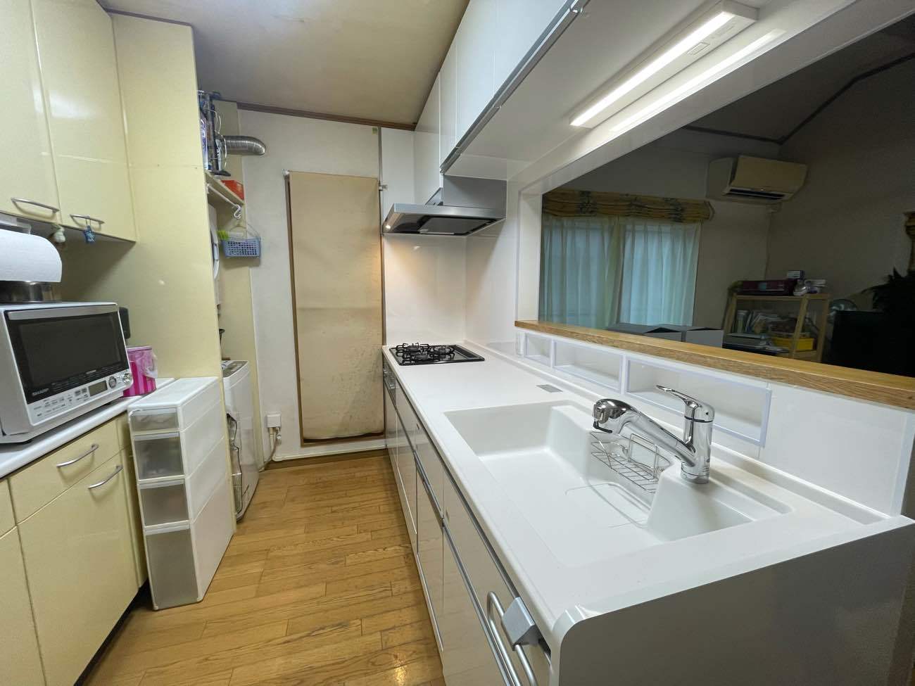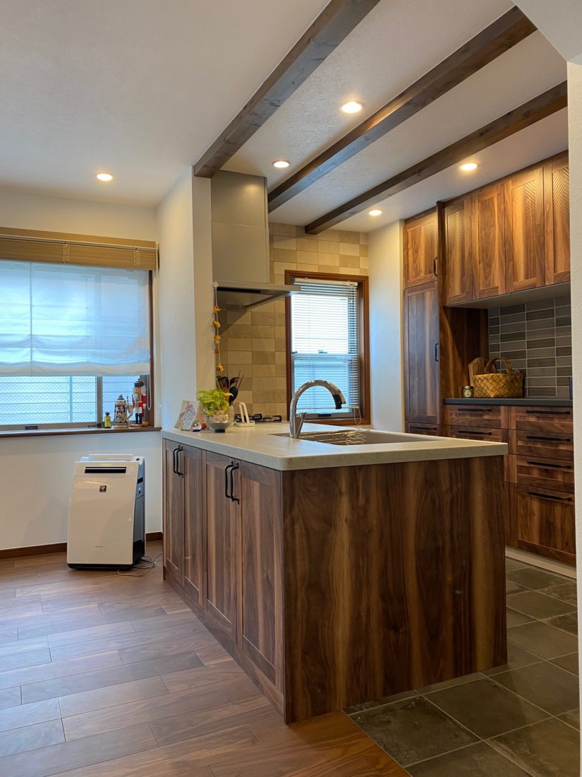 キッチン吊り戸を撤去しフラット対面キッチンへリフォーム。隔てるものがないのでリビングにいるご家族様との会話がスムーズに!天井の化粧梁は奥様のご希望で設置。木の温もりがプラスされ、いいアクセントになりました。
