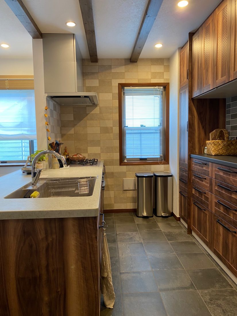 キッチンの床は、自然のリアルさをより追及し、高品質なテクスチャーを表現した石目柄のタイルをチョイスしました。
