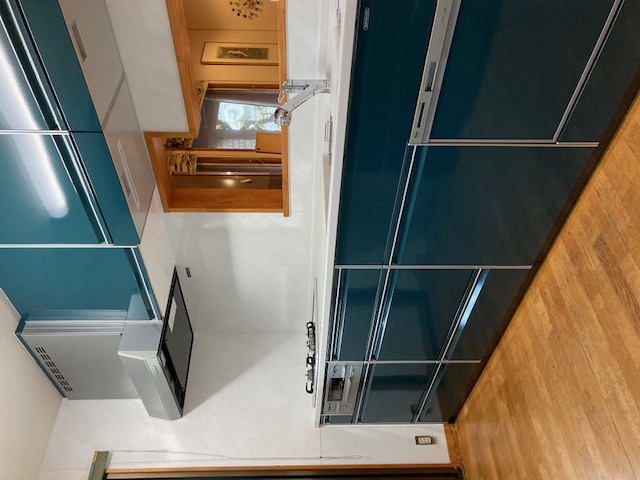 他にはあまりない深みのある落ち着いたブルーグリーンのキッチン。派手すぎない上品な色合いで高級感がありますね。背面収納も設置し、使い勝手・収納力ともにアップしました。