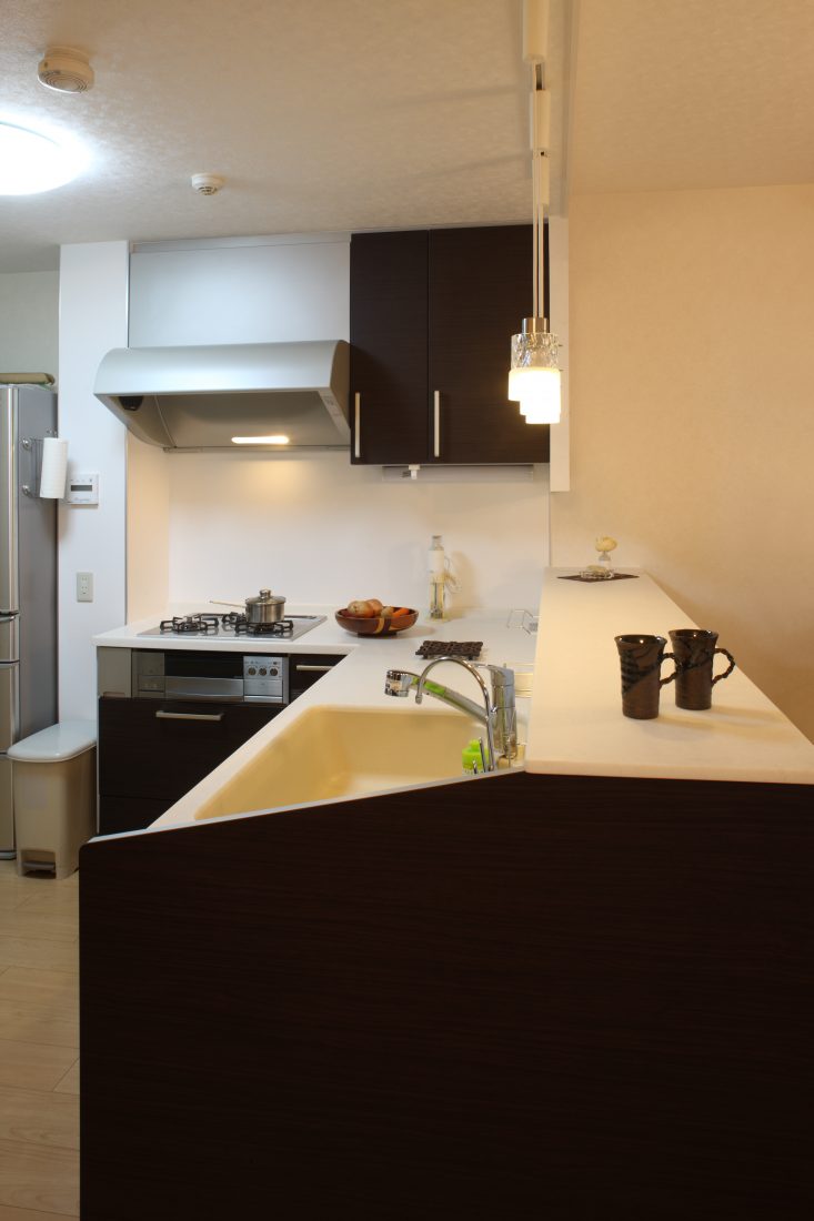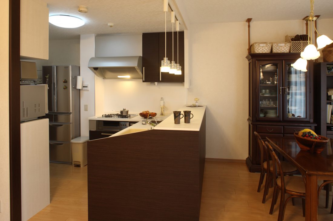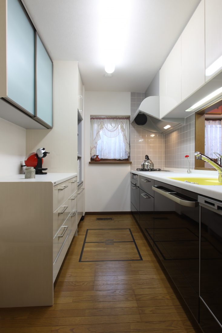 ご年齢の事もあり、バリアフリーなども考えて2世帯住宅の1階部分を改修。安全面を考えたキッチンの改修がポイントです。収納力が抜群のキッチンに、IHクッキングヒーターを導入。