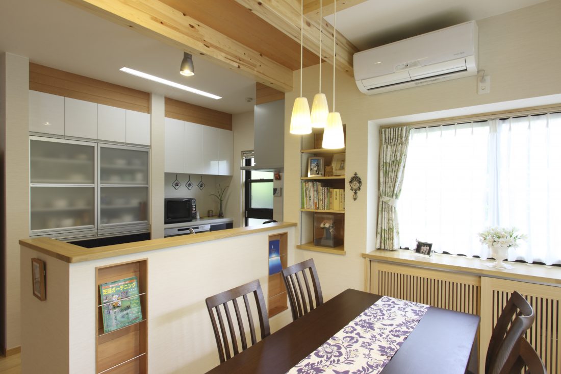 ダイニングスペースの上部はハリを敢えて見せる事で開放感を演出しています。