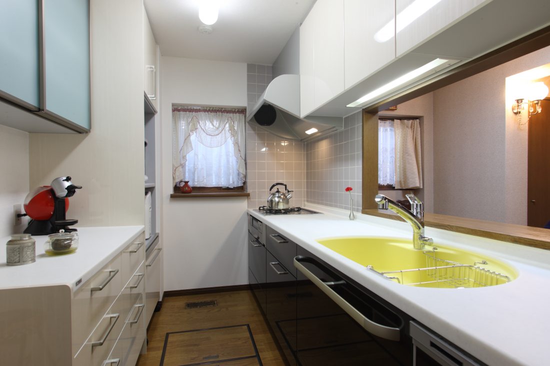 限られた空間の中でのリフォームですが、上下で違うツートンカラーやシンクのレモンイエローがアクセントになってキッチンに立つのが楽しいとのお声をいただきました。